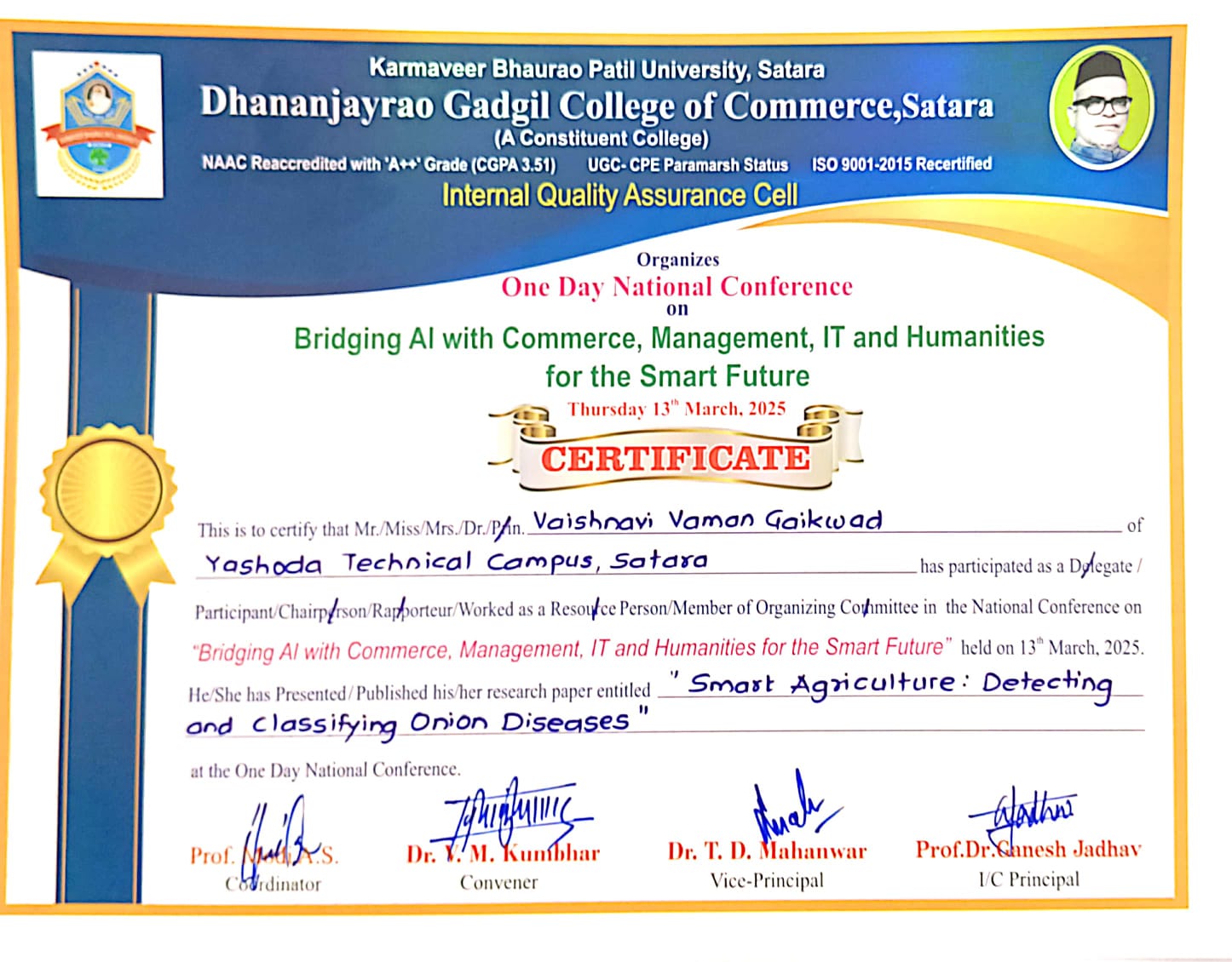 Miss Vaishnavi Vaman Gaikwad from Yashoda Technical Campus, Satara, participated in the One Day National Conference on "Bridging AI with Commerce, Management, IT, and Humanities for the Smart Future," organized by the Internal Quality Assurance Cell of Dhananjayrao Gadgil College of Commerce, Satara, under Karmaveer Bhaurao Patil University, Satara. The conference, held on March 13, 2025, was ISO 9001-2015 recertified and NAAC A++ accredited. She attended as a delegate and presented her research paper titled "Smart Agriculture: Detecting and Classifying Onion Diseases." The event was coordinated by Dr. V.M. Kumbhar, convened by Dr. T.D. Mahanwar, and overseen by Prof. Dr. Ganesh Jadhav, Vice-Principal/Principal.