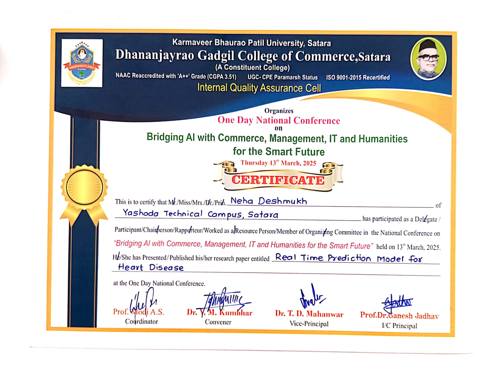 Miss Neha Deshmukh from Yashoda Technical Campus, Satara, participated as a delegate in the One Day National Conference on "Bridging AI with Commerce, Management, IT, and Humanities for the Smart Future," organized by the Internal Quality Assurance Cell of Dhananjayrao Gadgil College of Commerce, Satara, under Karmaveer Bhaurao Patil University, Satara. The conference, which was ISO 9001-2015 recertified and NAAC A++ accredited, took place on March 13, 2025. She presented her research paper titled "Real-Time Prediction Model for Heart Disease." The event was coordinated by Prof. A.S. Jodi, convened by Dr. V.M. Kumbhar, and overseen by Dr. T.D. Mahanwar and Prof. Dr. Ganesh Jadhav, Vice-Principal/Principal.