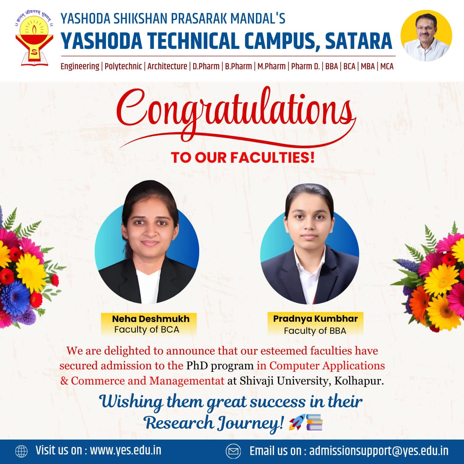 Neha Deshmukh, a faculty member of the BCA department at Yashoda Technical Campus, Satara, has secured admission to the PhD program in Computer Applications at Shivaji University, Kolhapur. The institution has congratulated her on this achievement and wished her great success in her research journey.