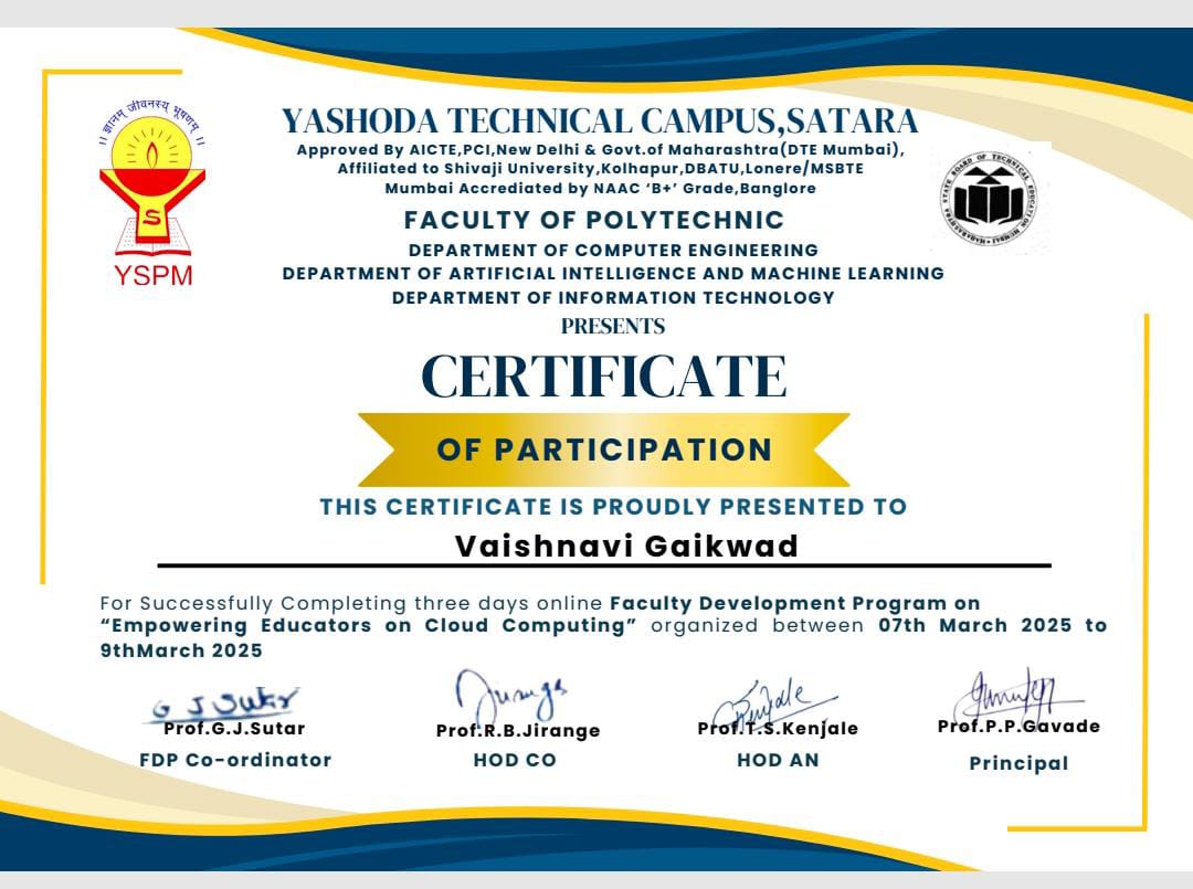 The certificate is issued by Yashoda Technical Campus, Satara, under the Faculty of Polytechnic and its Department of Computer Engineering, Artificial Intelligence & Machine Learning, and Information Technology. It is awarded to Vaishnavi Gaikwad for successfully completing a three-day online Faculty Development Program (FDP) titled "Empowering Educators on Cloud Computing", held from 7th March 2025 to 9th March 2025. The certificate is signed by Prof. G. J. Sutar (FDP Coordinator), Prof. R. B. Jirange (HOD CO), Prof. T. S. Kenjale (HOD AN), and Prof. P. P. Gavade (Principal).