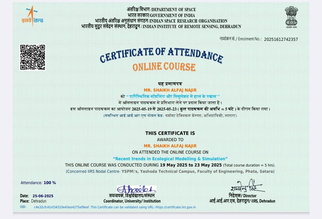 Mr. Alfaj Najir Shaikh, assistant professor in Civil Engineering has attended and successfully completed one-week National Level FDP on Recent trends in Ecological Modelling & Simulation organised by Department of Space, Government of India, Indian Institute of Remote Sensing, Dehradun from 19/05/2025 to 23/05/2025.