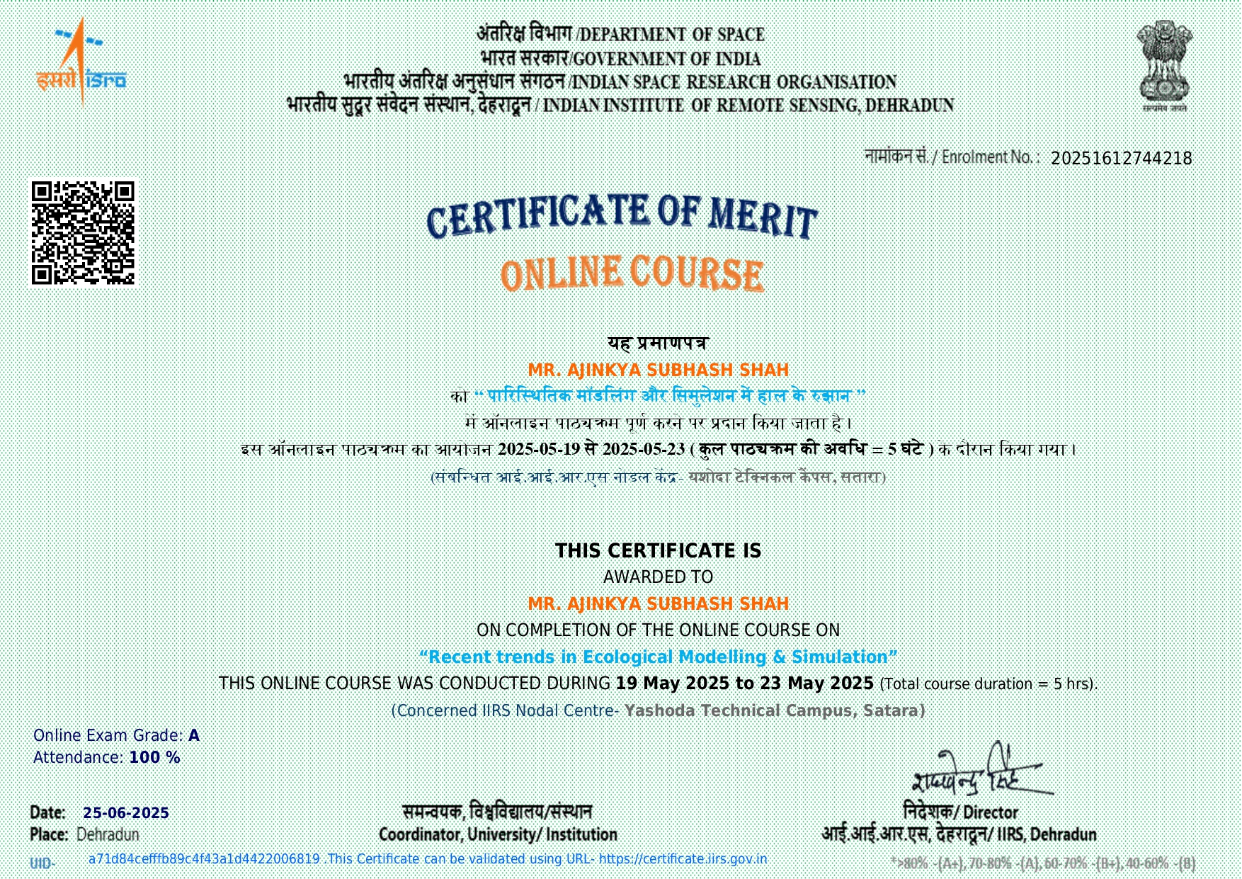 Mr. Ajinkya Subhash Shah, assistant professor in Civil Engineering has attended and successfully completed one-week National Level FDP on Recent trends in Ecological Modelling & Simulation organised by Department of Space, Government of India, Indian Institute of Remote Sensing, Dehradun from 19/05/2025 to 23/05/2025.