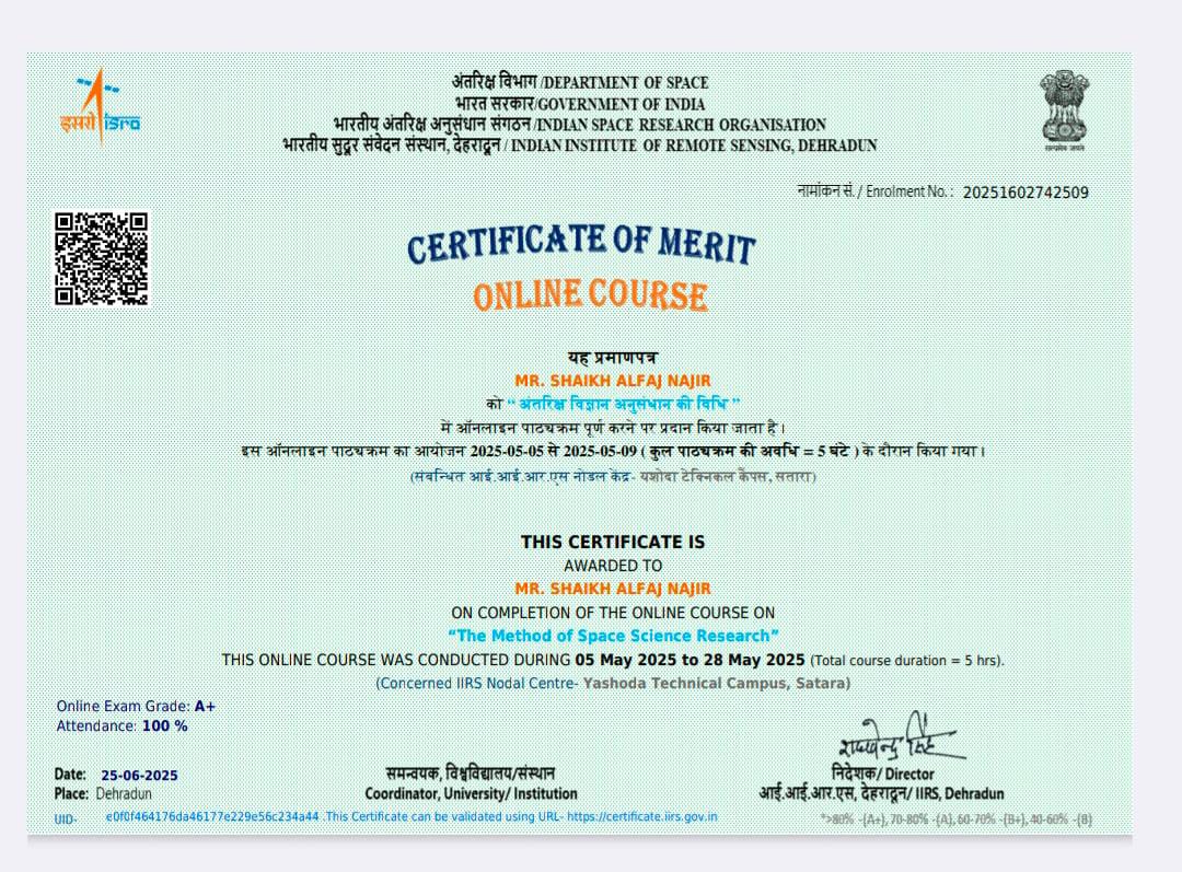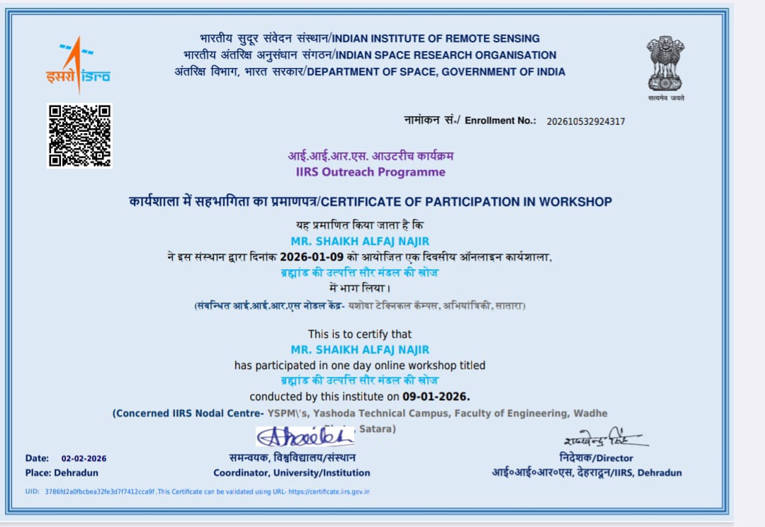 Mr. Alfaj N Shaikh, Assistant professor in Civil Engineering has attended and successfully completed online course on “Bramhand ki Utpati Sour Mandal Ki Khoj” organized by IIRS on 09/01/2026.