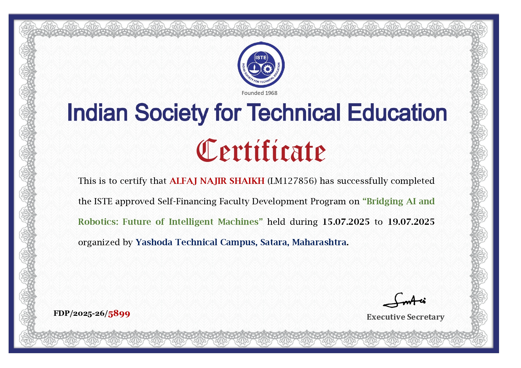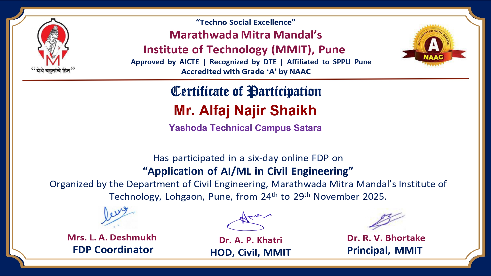 Mr. Alfaj N Shaikh, Assistant professor in Civil Engineering has attended and successfully completed six-day online Faculty Development Programme (FDP) on “Application of AI/ML in Civil Engineering” organized by Department of Civil Engineering, Marathwada Mitra Mandal’s Institute of Technology, Lohgaon, Pune from 24/11/2025 to 29/11/2025.