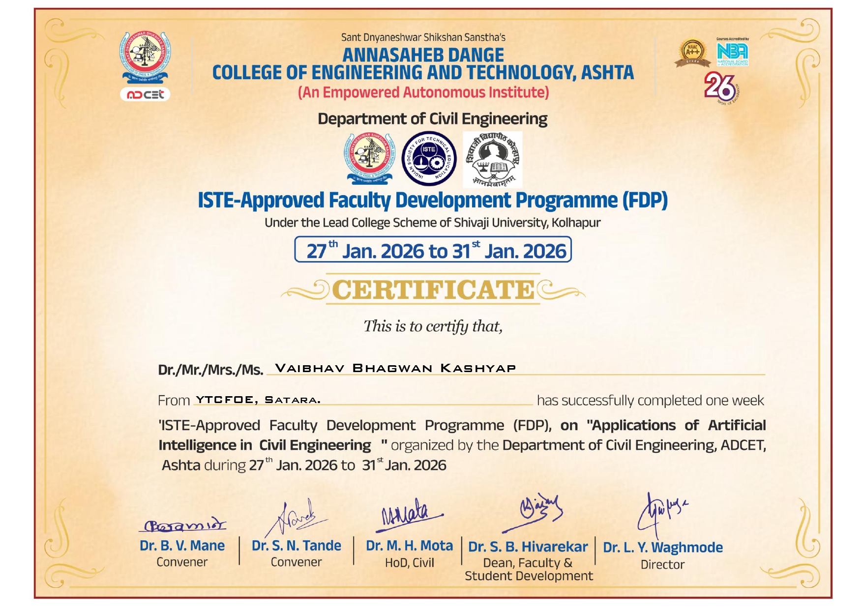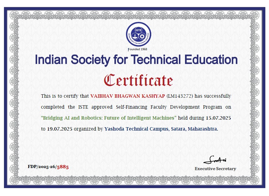 Mr. Vaibhav B Kashyap, Assistant professor in Civil Engineering has attended and successfully completed ISTE approved FDP on “Application of Artificial Intelligence in Civil Engineering” organized by Department of Civil Engineering, ADCET, Ashta from 27th – 31st January, 2026.