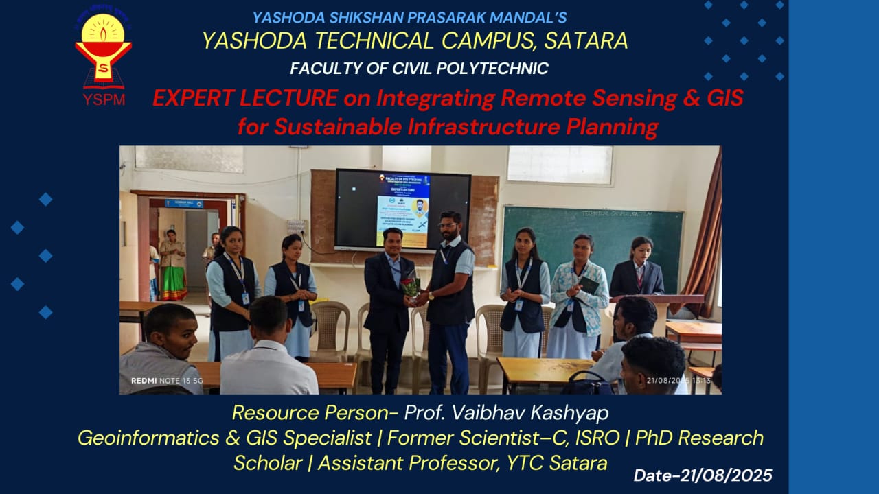 Prof. Vaibhav Kashyap, Assistant Professor, department of Civil Engineering, Faculty of Engineering, Yashoda Technical campus, Satara has delivered an expert lecture on "Integrating Remote Sensing & GIS for Sustainable Infrastructure Planning" on 21st August 2025 to second year of Civil department of yashoda college of Polytechnic, Satara on 21/08/2025. Sir has shared valuable insights on the role of geospatial technologies in sustainable infrastructure.