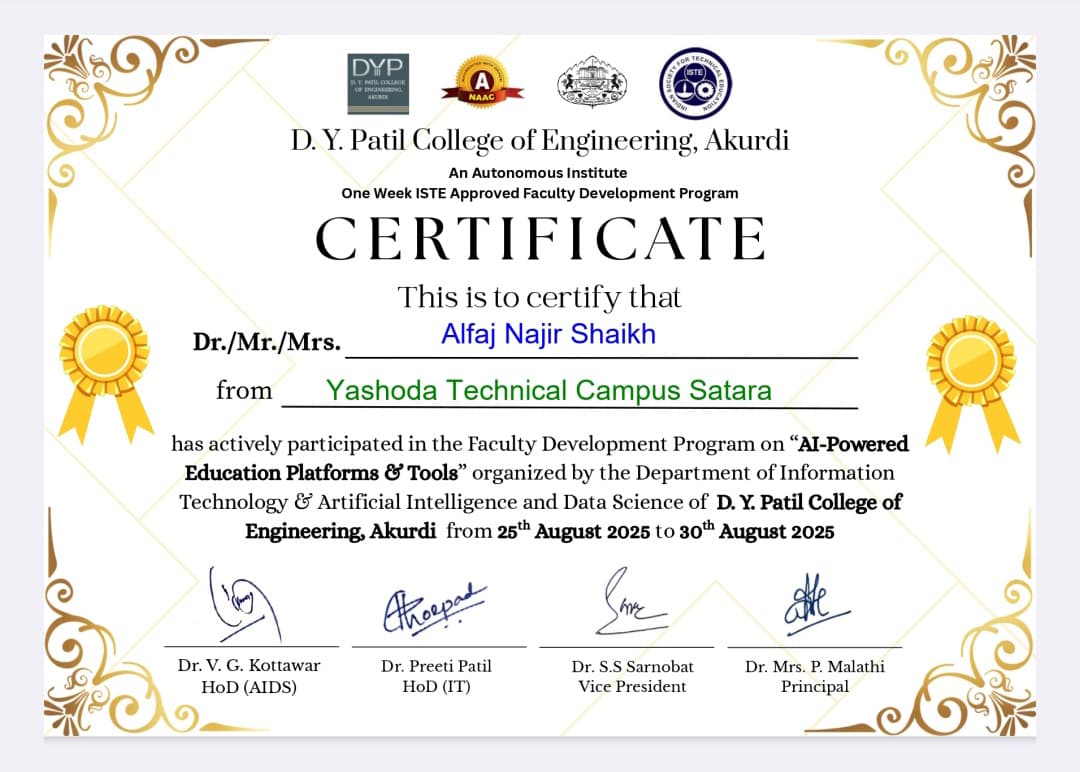 Mr. Alfaj N Shaikh, assistant professor in Civil Engineering has attended and successfully completed one-week FDP on AI-Powered Education Platforms & Tools organized by D Y Patil College of Engineering, Akurdi, Pune from 25/08/2025 to 30/08/2025.