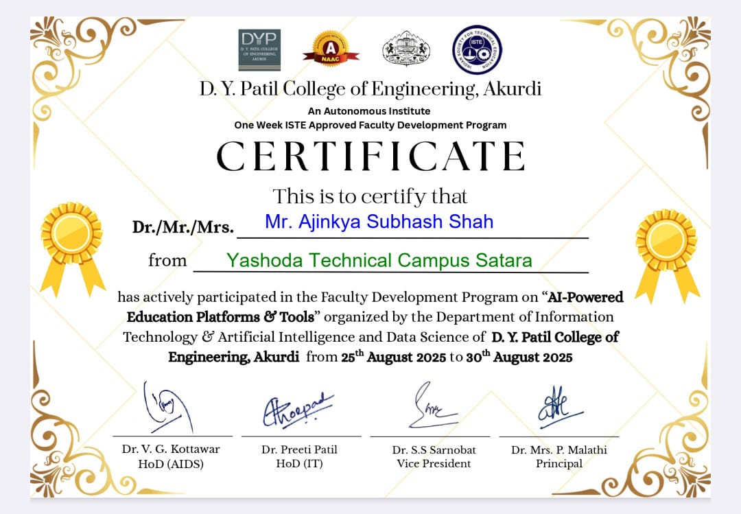 Mr. Ajinkya Subhash Shah, assistant professor in Civil Engineering has attended and successfully completed one-week FDP on AI-Powered Education Platforms & Tools organized by D Y Patil College of Engineering, Akurdi, Pune from 25/08/2025 to 30/08/2025.