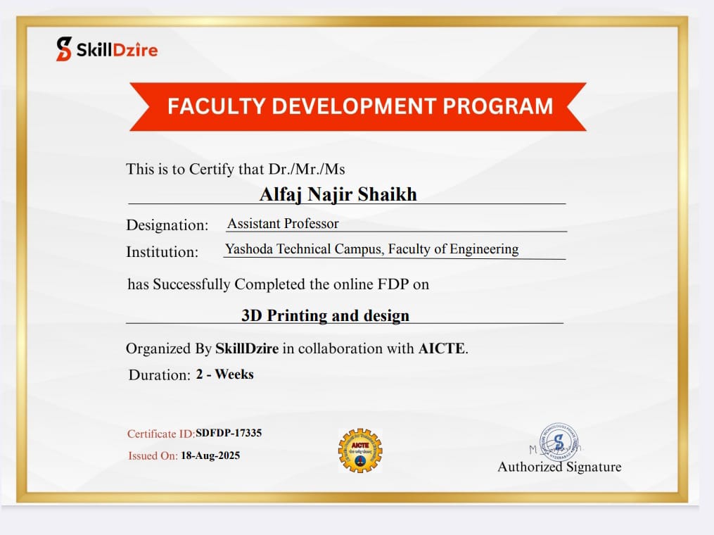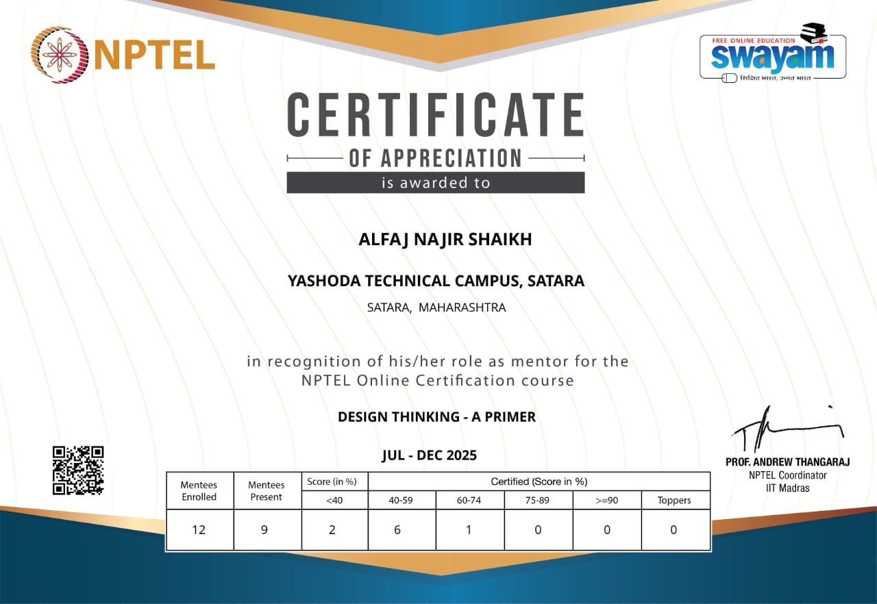 Mr. Alfaj N Shaikh, Assistant Professor, Department of Civil Engineering, Faculty of Engineering, Yashoda technical campus, Satara has successfully participated & completed four weeks (Jan-Feb 2025) NPTEL- ELITE course on Effective Engineering Teaching in Practice.
