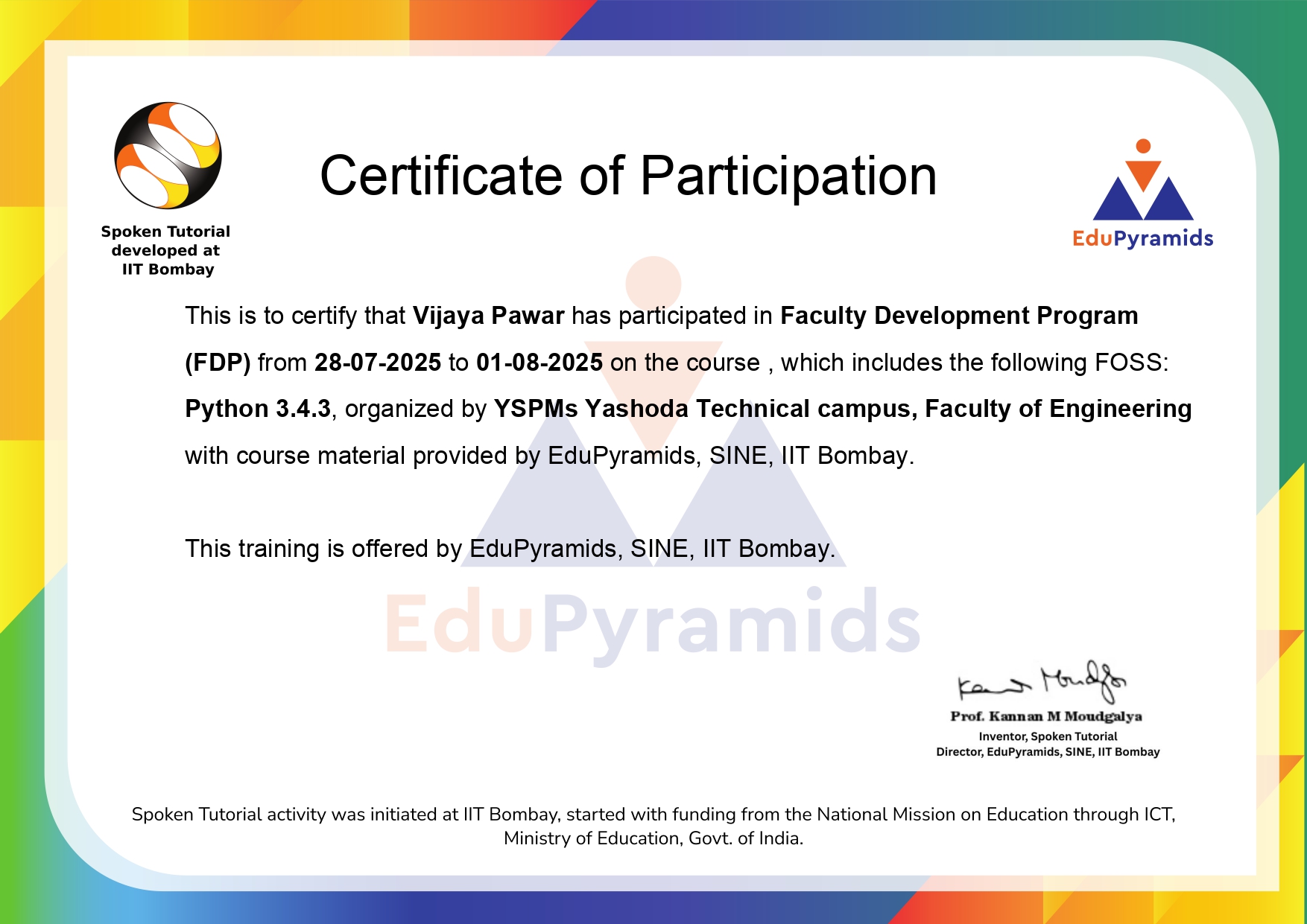 Mrs. Vijaya Pralhad Pawar, Faculty members of the AICTE approved institutions of Yashoda Tehnical Campus has successfully participated & completed AICTE Training And Learning (ATAL) Academy Faculty Development Program on Sustainable Smart Cities: Integrating Technology and Infrastructure at MET'S INSTITUTE OF ENGINEERING from 06/01/2025 to 11/01/2025.