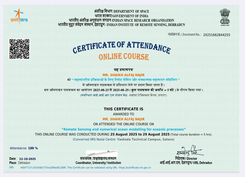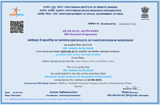 Mr. Alfaj N Shaikh, assistant professor in Civil Engineering has attended and successfully completed one-day online workshop on Fundamental of Remote sensing and GIS organized by IIRS on 08/09/2025 to 19/09/2025.