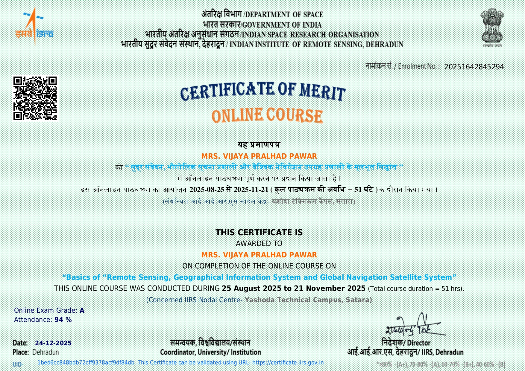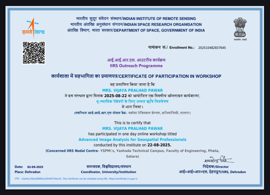 Vijaya P Pawar, Assistant professor in Civil Engineering has attended and successfully completed online course on Basics of “Remote Sensing, Geographical Information System and Global Navigation Satellite System” organized by IIRS from 25/08/2025 to 21/11/2025.