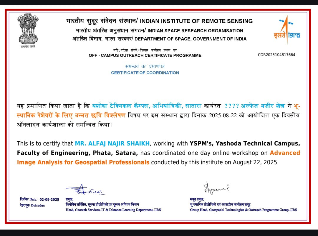 Mr. Alfaj N Shaikh, Assistant professor in Civil Engineering has attended and successfully completed online course on Basics of “Remote Sensing, Geographical Information System and Global Navigation Satellite System” organized by IIRS from 25/08/2025 to 21/11/2025.