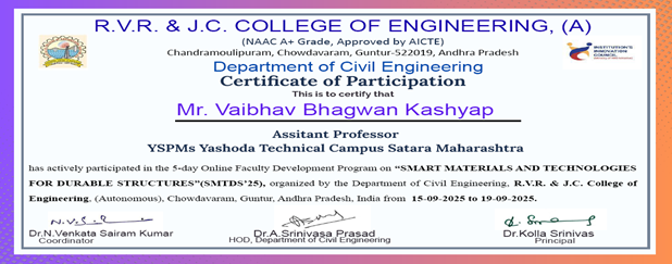 Mr. Vaibhav B Kashyap, Assistant professor, Assistant professor in Civil Engineering has attended and successfully completed one-week online FDP on “AI and Digital Technologies in Civil Engineering” organized by Department of Civil Engineering, SIPNA college of Engineering & Technology, Amaravati from 15/12/2025 to 20/12/2025
