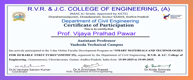 Mrs. Vijaya P Pawar, Assistant professor in Civil Engineering has attended and successfully completed ATAL FDP on Sustainable Practices and Innovative Trends in Civil Engineering organized by Dr Lankapalli Bullayya College of Engineering on 0/11/2025 to 15/11/2025.