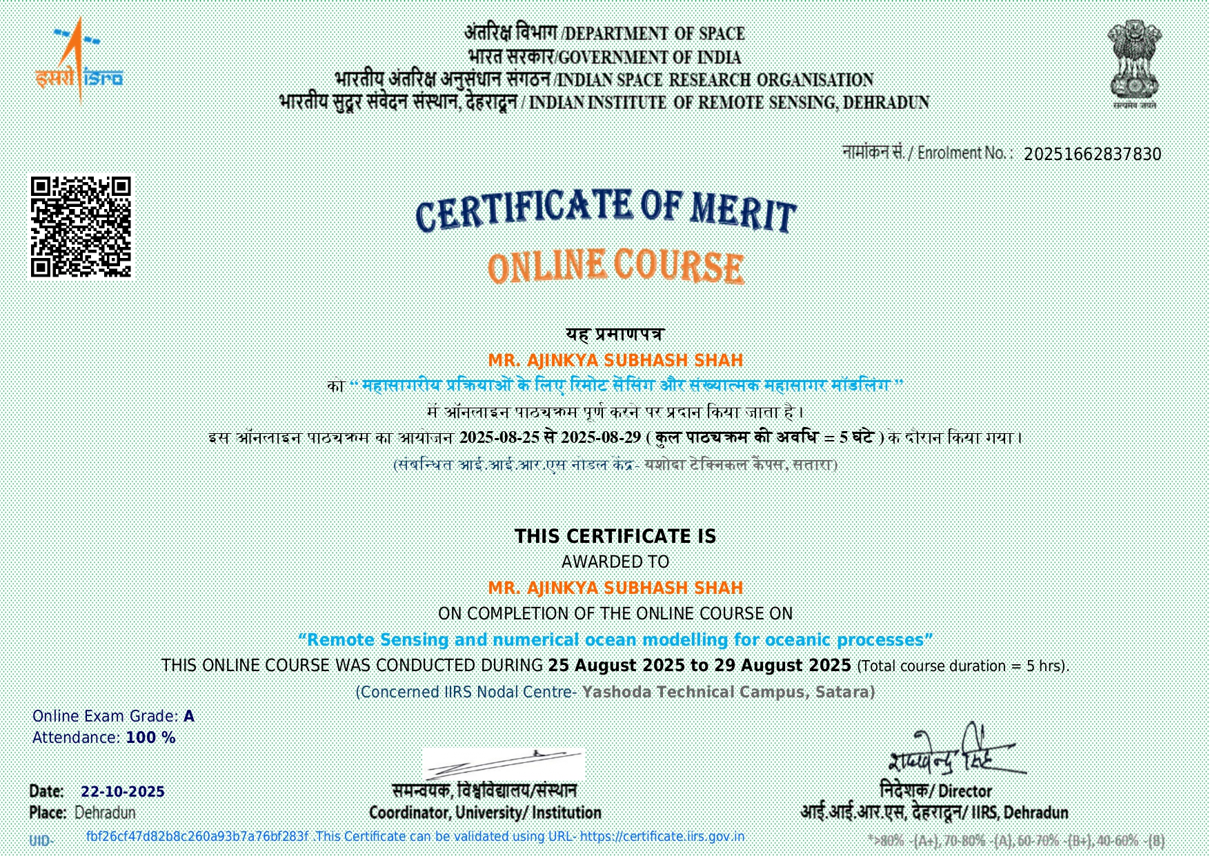 Mr. Ajinkya S Shah, Assistant professor in Civil Engineering has attended and successfully completed online course on Basics of “Remote Sensing, Geographical Information System and Global Navigation Satellite System” organized by IIRS from 25/08/2025 to 21/11/2025.