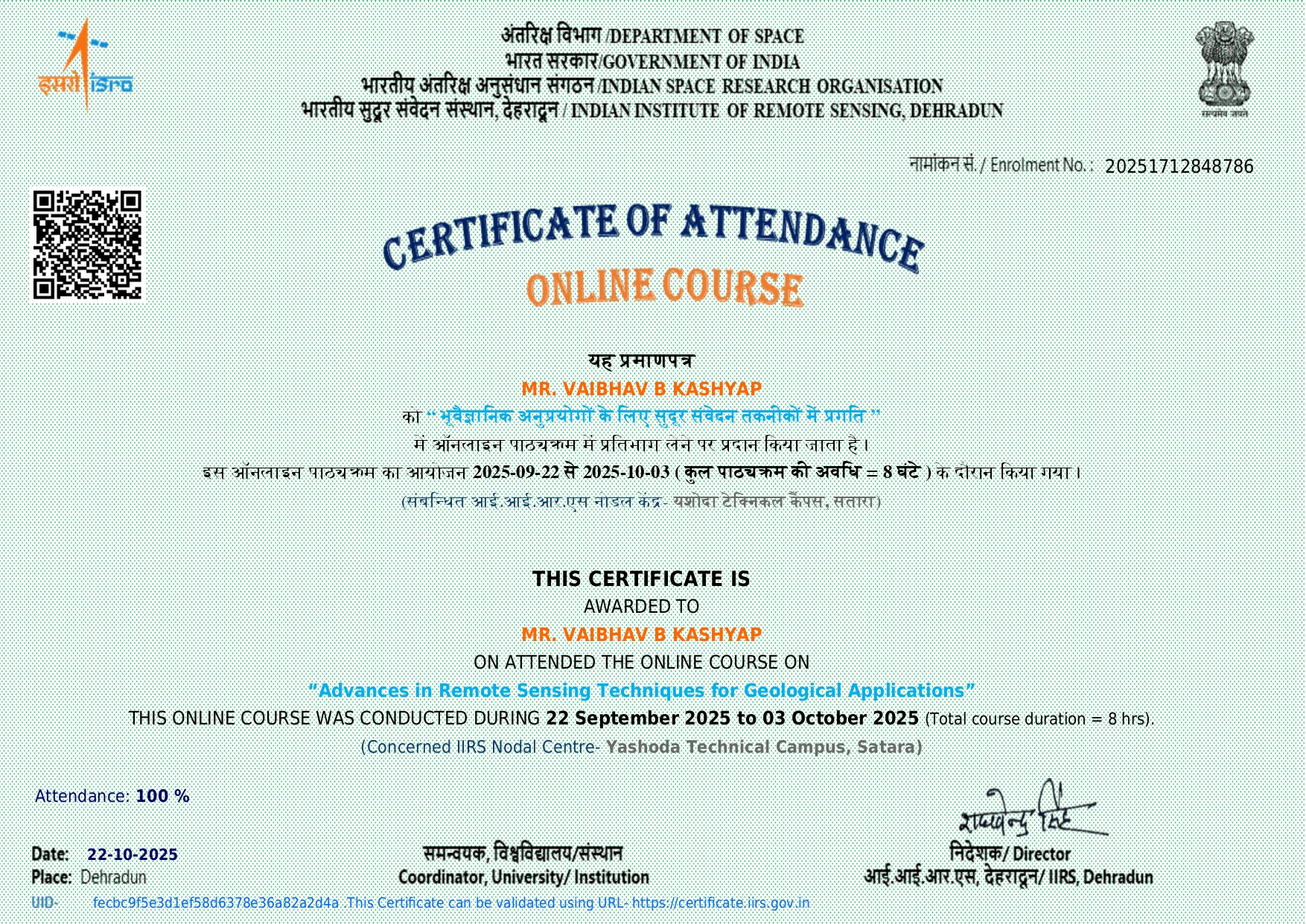 Mr. Vaibhav B Kashyap, assistant professor in Civil Engineering has attended and successfully completed online course on Advances in Remote Sensing techniques for Geological Applications organized by IIRS on 22/09/2025 to 03/10/2025.