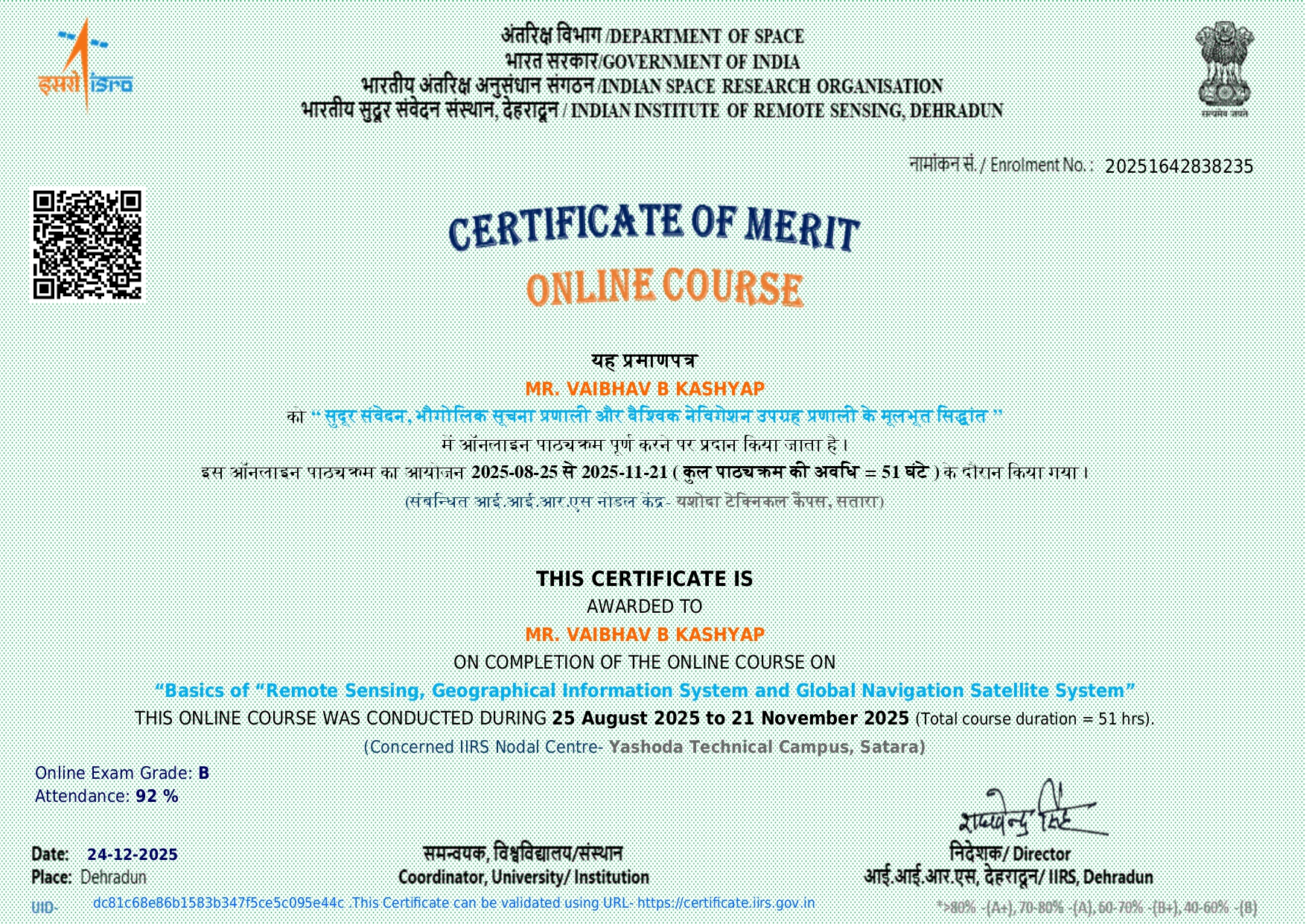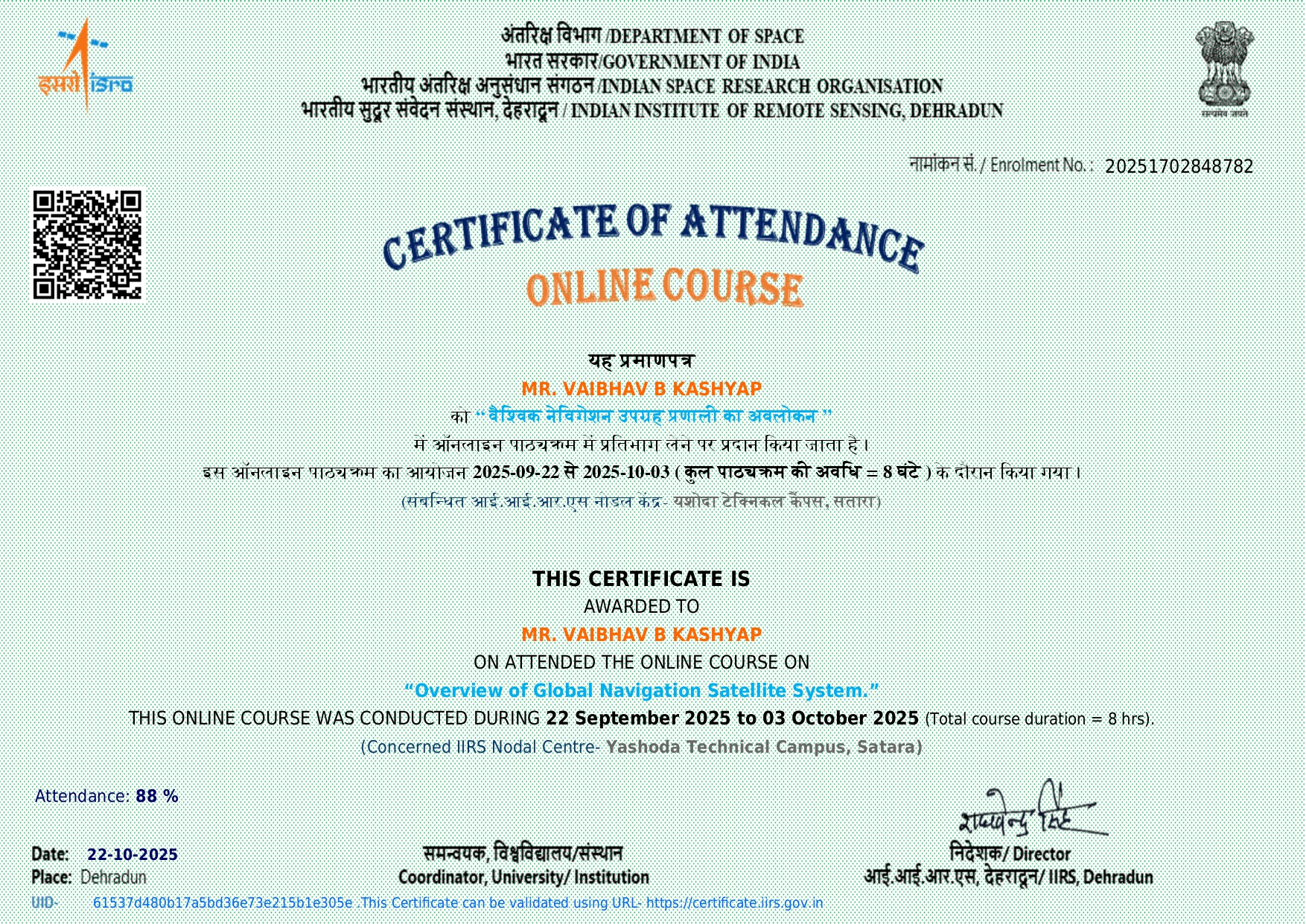 Mr. Vaibhav B Kashyap, assistant professor in Civil Engineering has attended and successfully completed online course on Overview of Global Navigation Satellite System organized by IIRS on 22/09/2025 to 03/10/2025