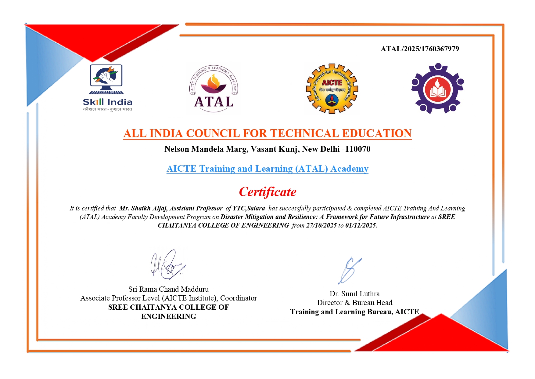 Mr. Shaikh Alfaj, Assistant Professor, Department of Civil Engineering has successfully participated & completed AICTE Training And Learning (ATAL) Academy Faculty Development Program on Disaster Mitigation and Resilience: A Framework for Future Infrastructure at SREE CHAITANYA COLLEGE OF ENGINEERING from 27/10/2025 to 01/11/2025.