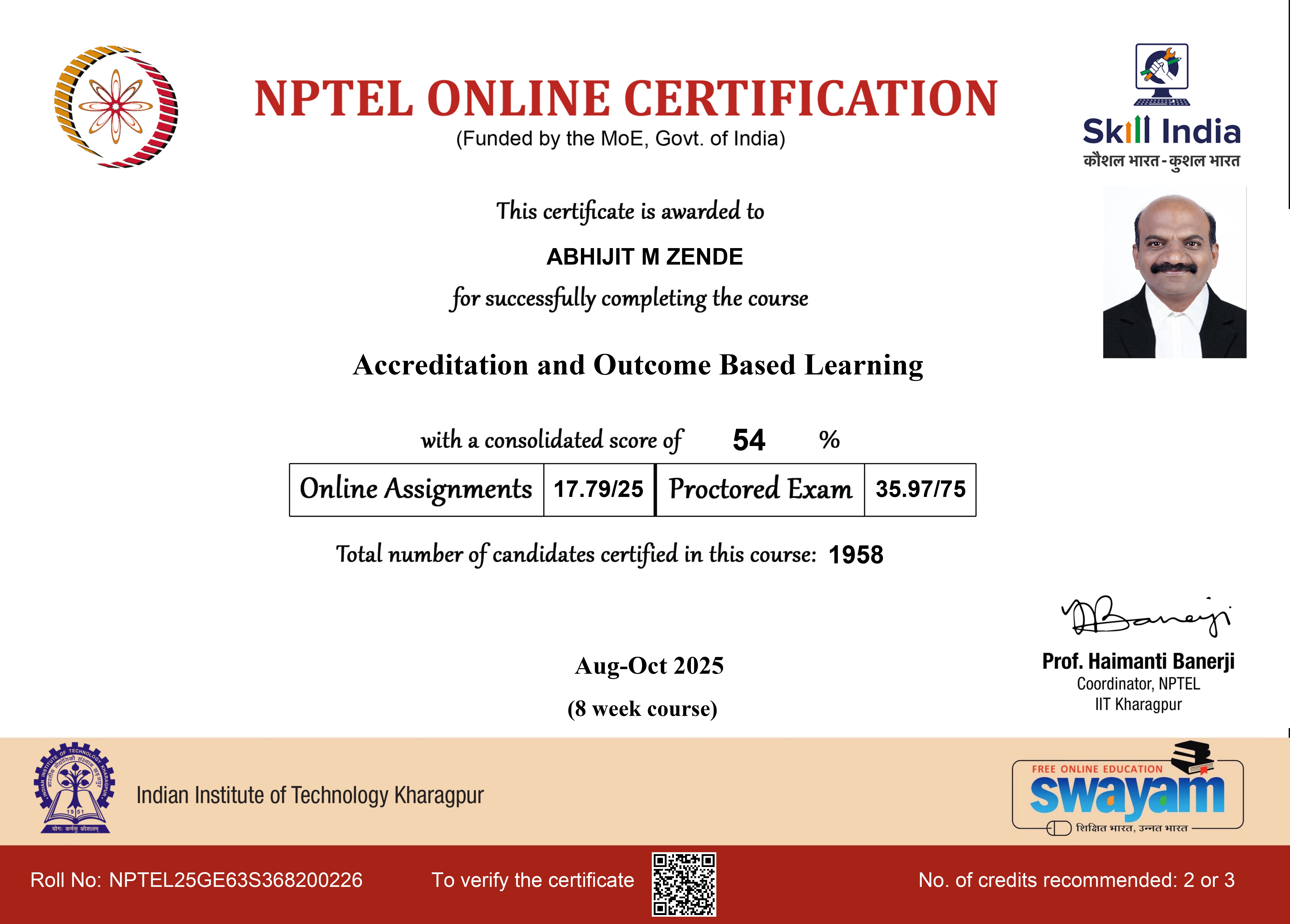 Dr. Abhijit M Zende, HOD and Associate Professor, Civil Engineering has attended and successfully completed NPTEL course on Accreditation and Outcome Based Learning.