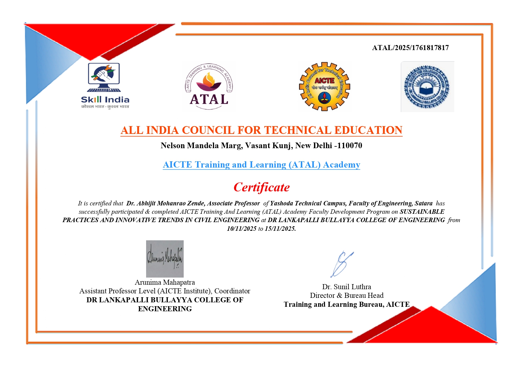 Dr. Abhijit M Zende, HOD and Associate Professor, Civil Engineering has attended and successfully completed ATAL FDP on Sustainable Practices and Innovative Trends in Civil Engineering organized by Dr Lankapalli Bullayya College of Engineering on 0/11/2025 to 15/11/2025.