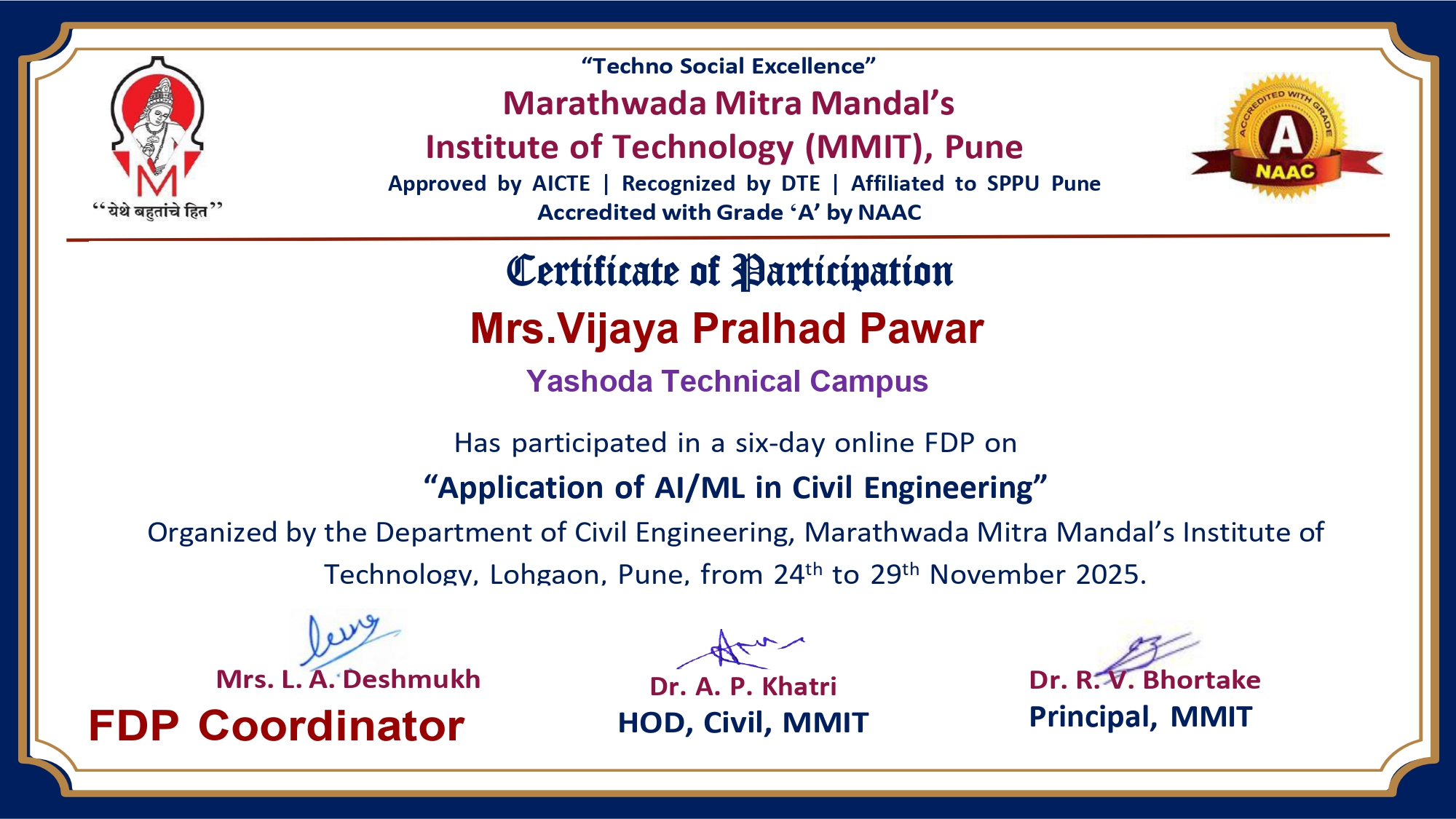 Mrs. Vijaya P Pawar, Assistant professor in Civil Engineering has attended and successfully completed six-day online Faculty Development Programme (FDP) on “Application of AI/ML in Civil Engineering” organized by Department of Civil Engineering, Marathwada Mitra Mandal’s Institute of Technology, Lohgaon, Pune from 24/11/2025 to 29/11/2025.