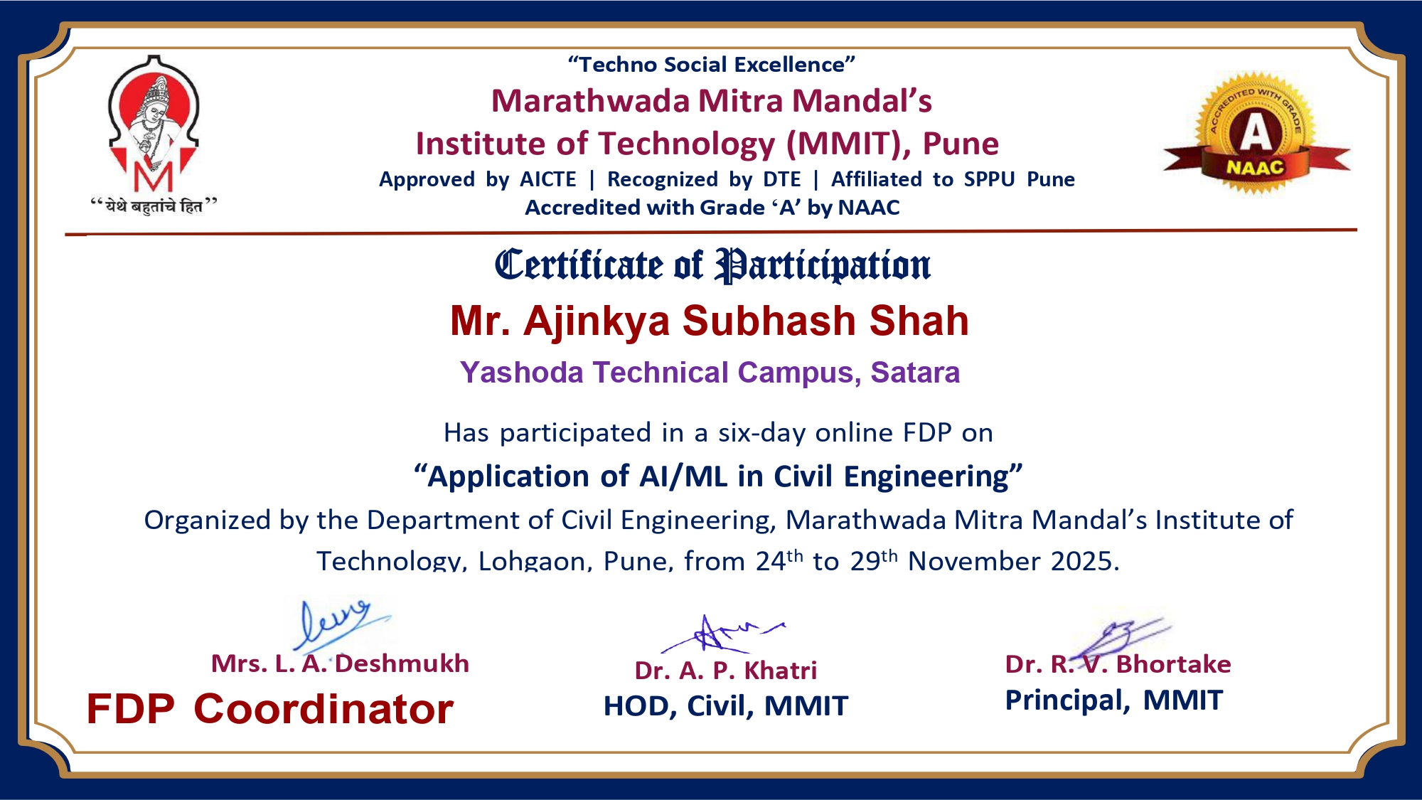 Mr. Ajinkya S Shah, Assistant professor in Civil Engineering has attended and successfully completed six-day online Faculty Development Programme (FDP) on “Application of AI/ML in Civil Engineering” organized by Department of Civil Engineering, Marathwada Mitra Mandal’s Institute of Technology, Lohgaon, Pune from 24/11/2025 to 29/11/2025.