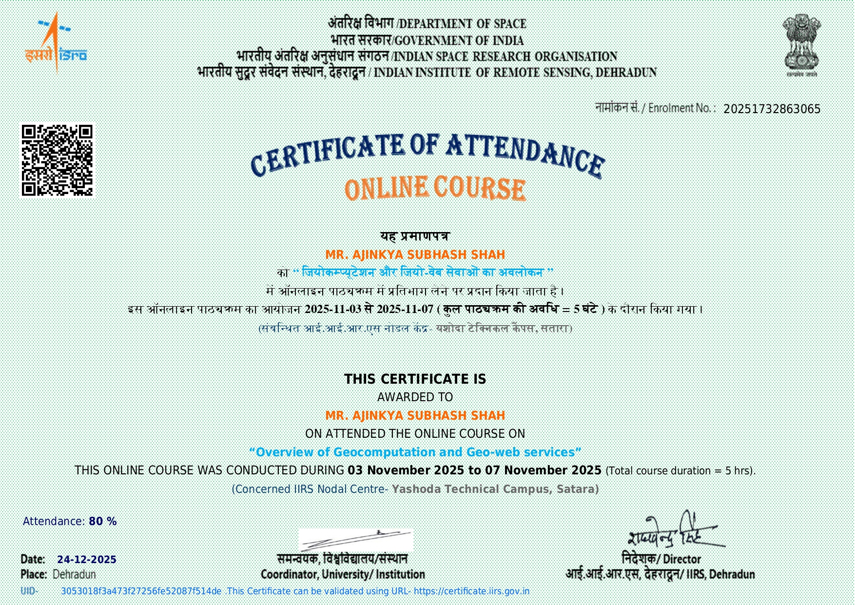 Mr. Ajinkya S Shah, Assistant professor in Civil Engineering has attended and successfully completed online course on “Overview of Geocomputation and Geo-web services” organized by IIRS from 03/11/2025 to 07/11/2025.