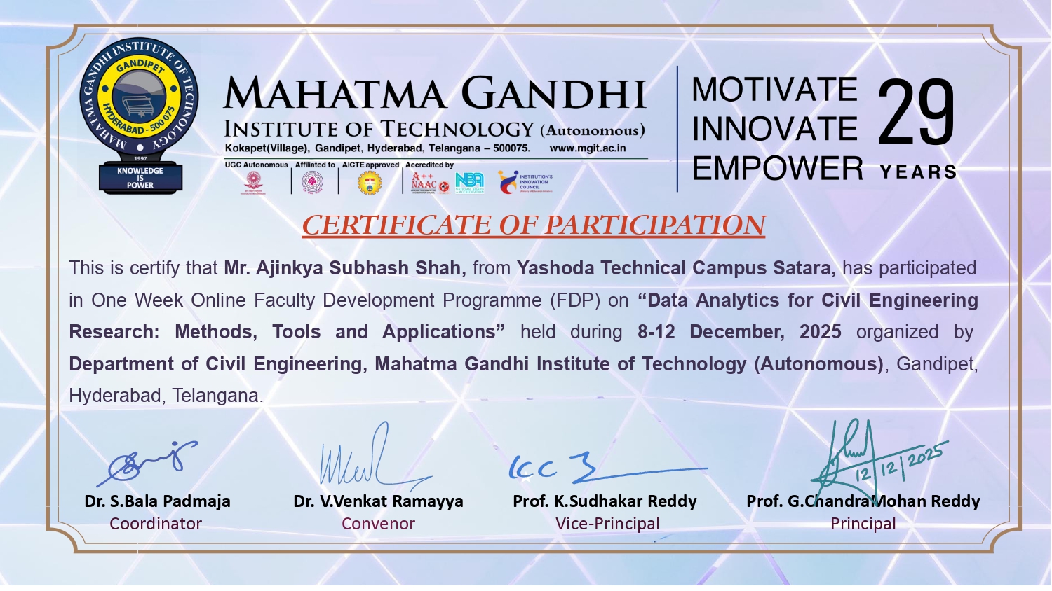 Mr. Ajinkya S Shah, Assistant professor in Civil Engineering has attended and successfully completed one-week online Faculty Development Programme (FDP) on “Data Analytics for Civil Engineering Research: Methods, Tools and Applications” organized by Department of Civil Engineering, Mahatma Gandhi Institute of Technology (Autonomous), Gandipet, Hyderabad, Telangana from 8-12 December, 2025.