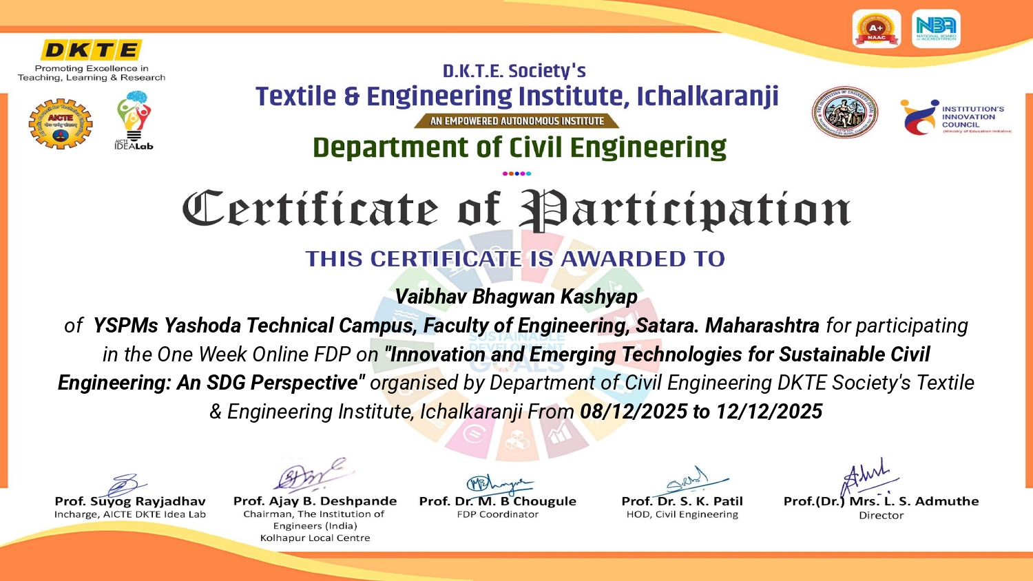 Mr. Vaibhav B Kashyap, Assistant professor in Civil Engineering has attended and successfully completed one-week online Faculty Development Programme (FDP) on “Innovation and Emerging Technologies for Sustainable Civil Engineering: An SDG Perspective” organized by Department of Civil Engineering, DKTE Society's Textile & Engineering Institute, Ichalkaranji from 8-12 December, 2025.