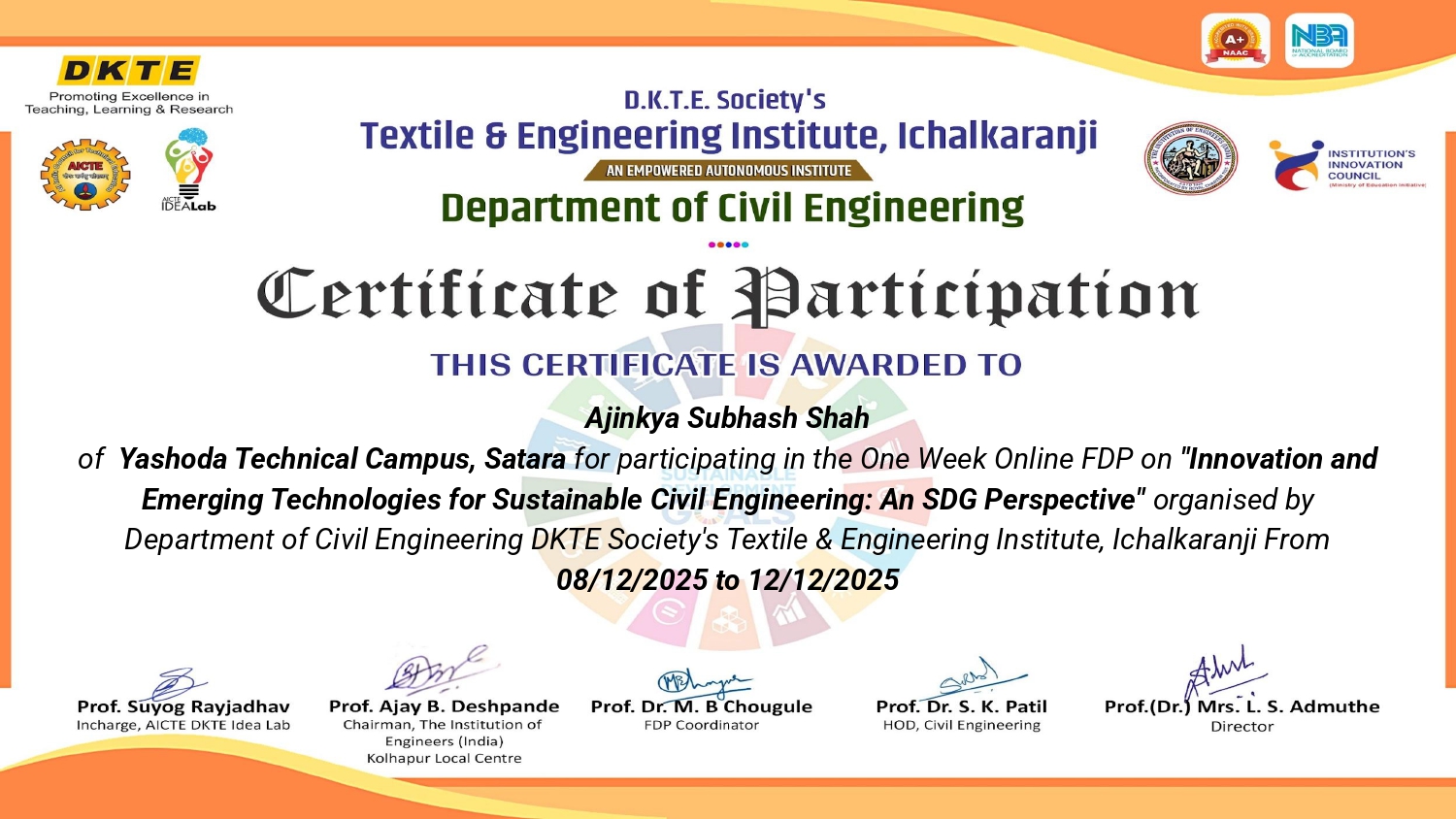 Mr. Ajinkya S Shah, Assistant professor in Civil Engineering has attended and successfully completed one-week online Faculty Development Programme (FDP) on “Innovation and Emerging Technologies for Sustainable Civil Engineering: An SDG Perspective” organized by Department of Civil Engineering, DKTE Society's Textile & Engineering Institute, Ichalkaranji from 8-12 December, 2025.