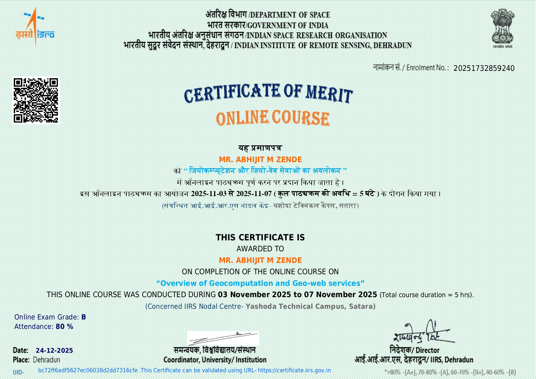Dr. A M Zende, HoD and Associate Professor, in Civil Engineering has attended and successfully completed online course on “Overview of Geocomputation and Geo-web services” organized by IIRS from 03/11/2025 to 07/11/2025.