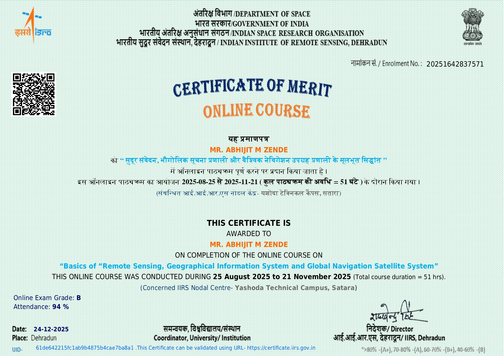 Dr. Abhijit M Zende, HOD and associate professor in Civil Engineering has attended and successfully completed online course on Overview of Global Navigation Satellite System organized by IIRS on 22/09/2025 to 03/10/2025