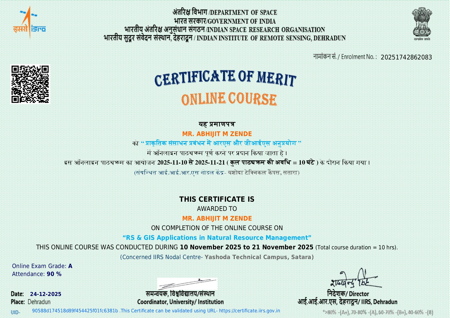 Dr. Abhijit M Zende, HoD and Associate Professor, in Civil Engineering has attended and successfully completed online course on “Remote Sensing, Geographical Information System in Natural Resource Management” organized by IIRS from 10/11/2025 to 21/11/2025.
