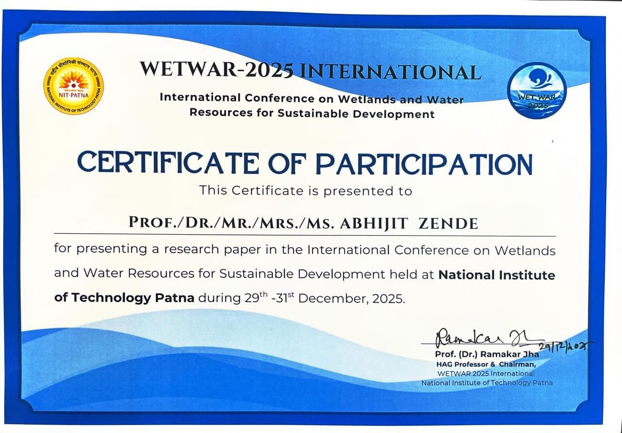 Dr. Abhijit M Zende, HOD and associate Professor in Department of CivilEngineering, YSPM's Yashoda Technical Campus, Satara has presented research paper on "Estimating sediment yield using a simplified curve number approach for semi-arid basin, western Maharashtra, India" in Internation conference on Wetlands and Water Resources for Sustainable Development held at National Institute of Technology Patna during 29th December to 31st December 2025.