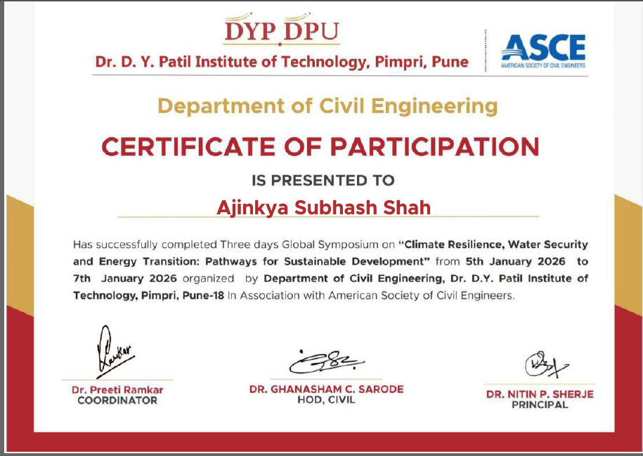 Mr. Ajinkya S Shah, Assistant professor in Civil Engineering has attended and successfully completed Three days global Symposium on “Climate, Resilience, Water Security and Energy Transition: Pathways for Sustainable Development” organized by Department of Civil Engineering, Dr. D. Y. Patil Institute of Technology, Pimpri from 5th – 7th January, 2026.