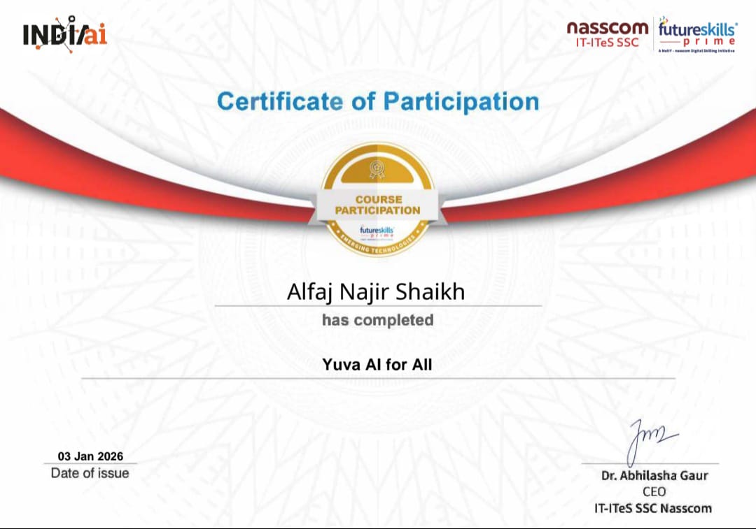 Mr. Alfaj N Shaikh, Assistant professor in Civil Engineering has participated in “Yuva AI for All” organized by nasscom IT-ITeS SSC and Futureskill Prime on 3rd January, 2026.