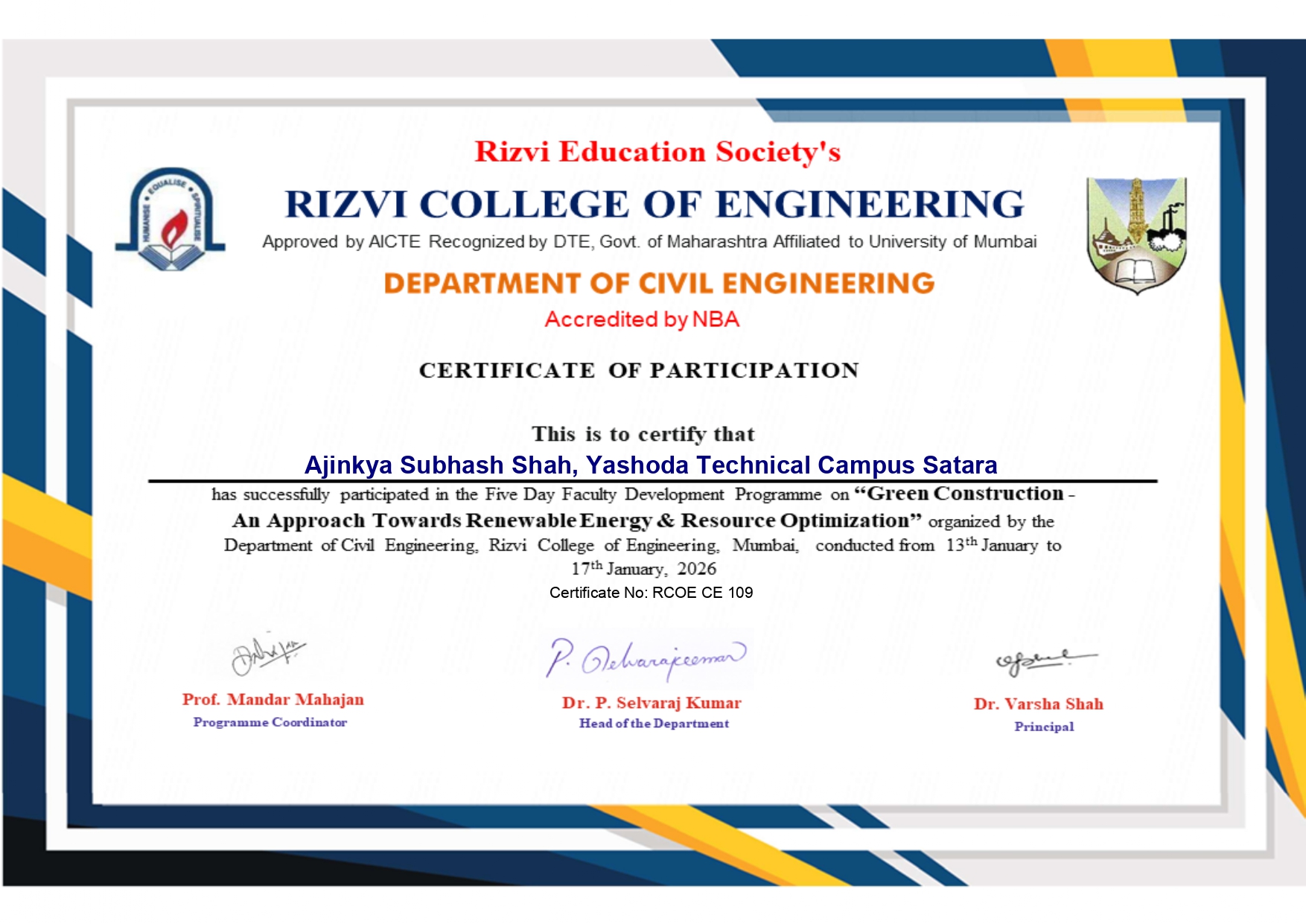 Mr. Ajinkya S Shah, Assistant professor in Civil Engineering has attended and successfully completed five day FDP on “Green Construction – An Approach towards Renewable Energy & Resources Optimization” organized by Department of Civil Engineering, Rizvi College of Engineering, Mumbai from 13/1/2026 to 17/1/2026.