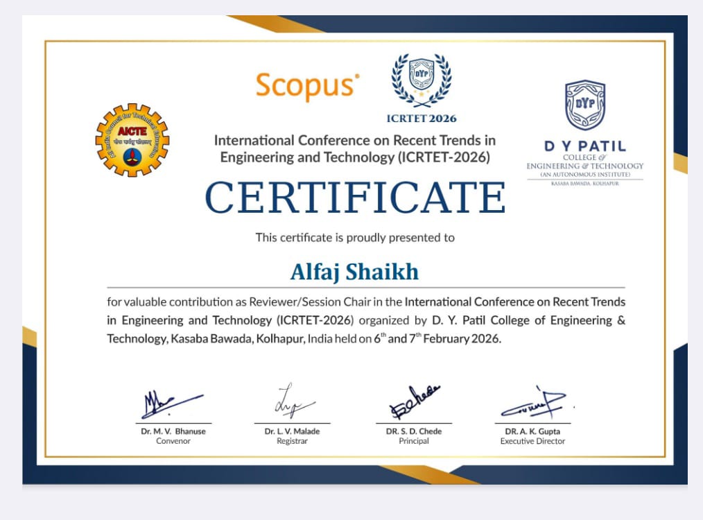 Mr. Alfaj N Shaikh, Assistant Professor in Department of Civil Engineering, YSPM's Yashoda Technical Campus, Satara has contributed as reviewer for research paper in International Conference on Recent Trends in Engineering and Technology (ICRTET 2026) held at D Y Patil College of Engineering and Technology, Kasaba Bawada, Kolhapur, during 6th February to 7th February 2026.
