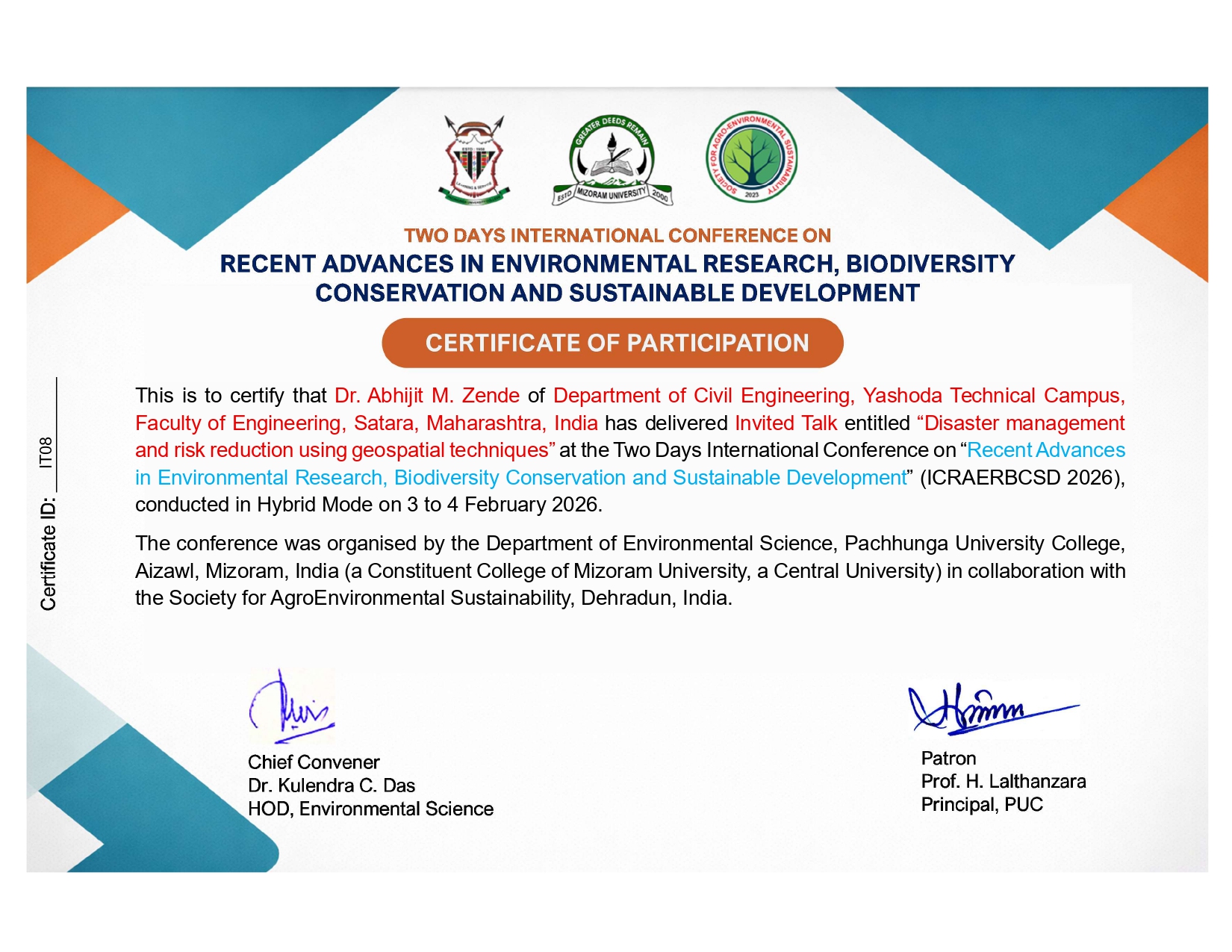Dr. Abhijit M Zende, Head and Associate Professor in Department of Civil Engineering, YSPM's Yashoda Technical Campus, Satara has delivered Invited Talk entitled Disaster Management and Risk reduction using geospatial techniques in International Conference on Recent Advances in Environmental Research, Biodiversity Conservation and Sustainable Development held by Pachhunga University College, Aizawl, Mizoram, during 3rd February and 4th February 2026.