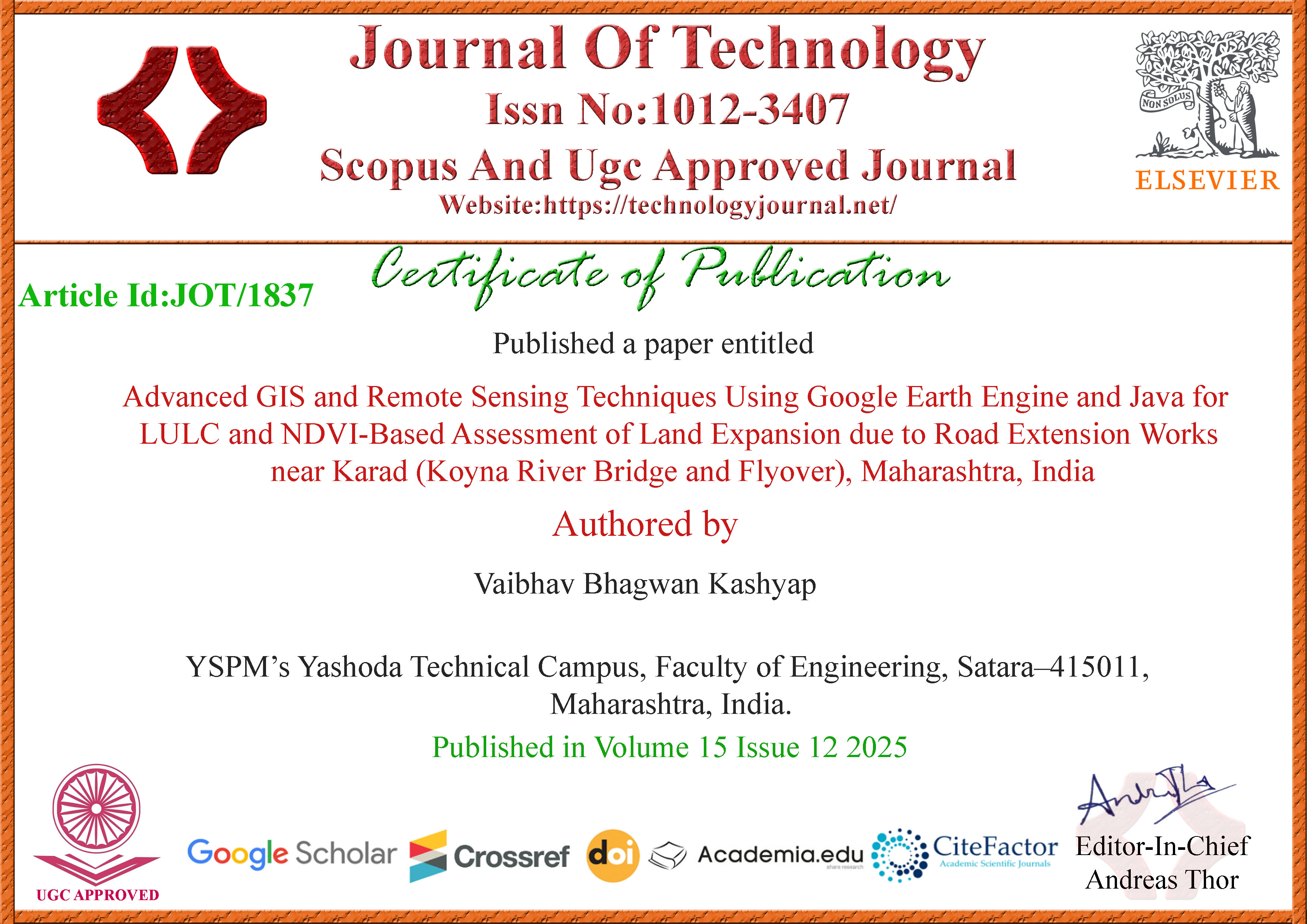 Mr. Vaibhav B Kashyap, Assistant professor in Civil Engineering has published a paper titled “Advanced GIS and Remote Sensing Techniques Using Google Earth Engine and Java for LULC and NDVI-Based Assessment of Land Expansion due to Road Extension Works near Karad (Koyna River Bridge and Flyover), Maharashtra, India” in Scopus approved Journal of Technology (ISSN – 1012-3407).