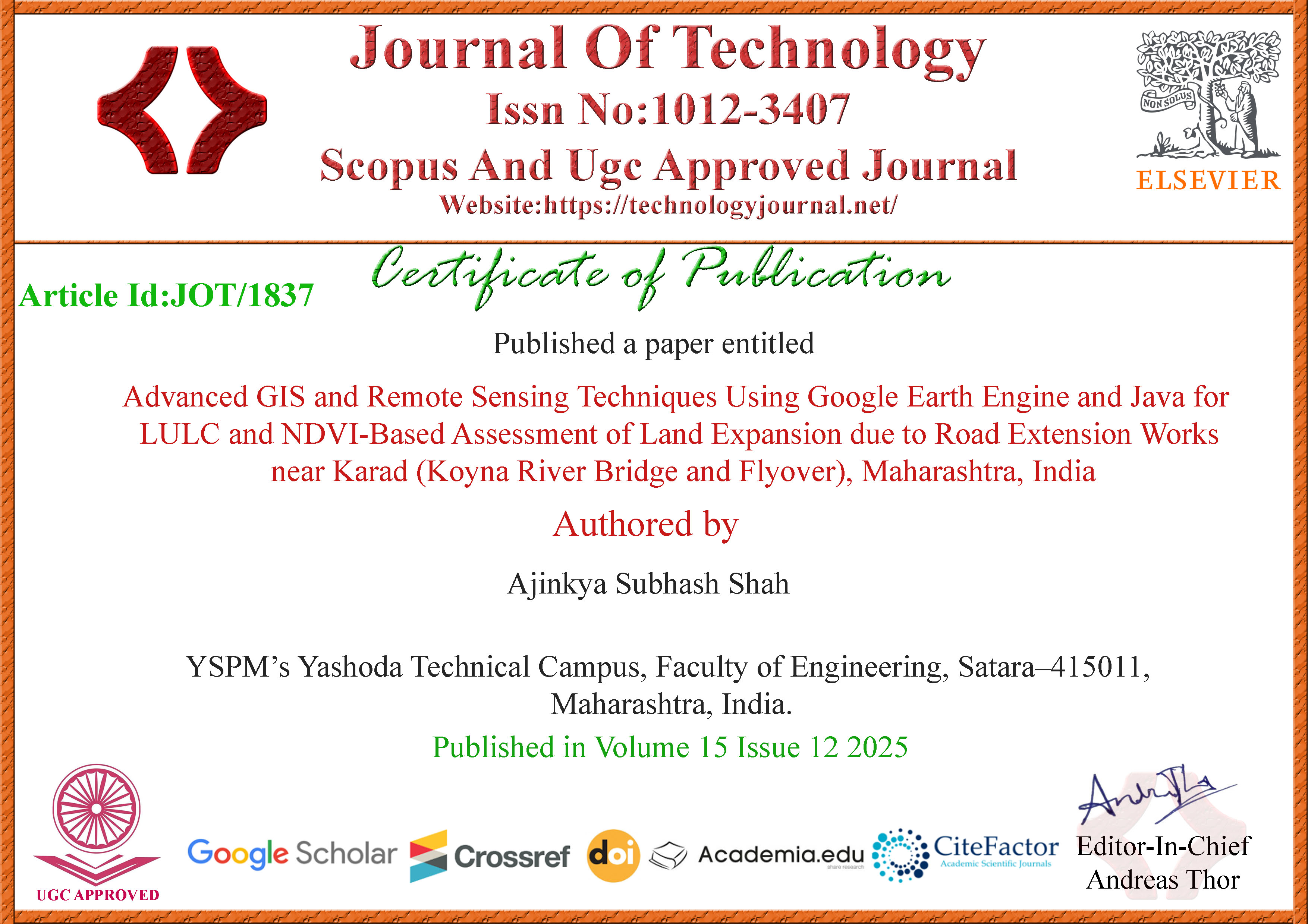 Ajinkya S Shah, Assistant professor in Civil Engineering has published a paper titled “Advanced GIS and Remote Sensing Techniques Using Google Earth Engine and Java for LULC and NDVI-Based Assessment of Land Expansion due to Road Extension Works near Karad (Koyna River Bridge and Flyover), Maharashtra, India” in Scopus approved Journal of Technology (ISSN – 1012-3407).