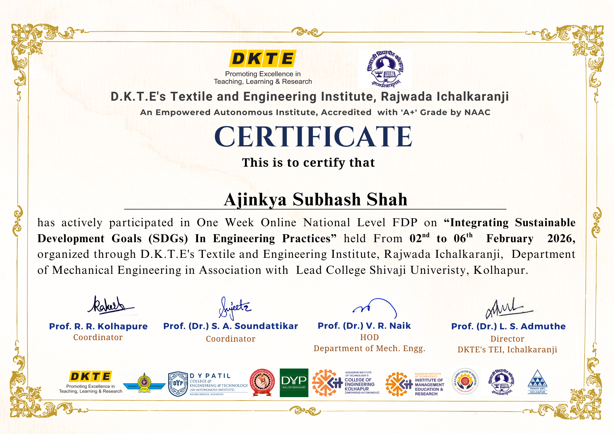 Mr. Ajinkya S Shah, Assistant professor in Civil Engineering has attended and successfully completed One week national level FDP on “Integrating Sustainable Development Goals in Engineering Practices” organized by DKTE's Textile and Engineering Institute, Icchalkaranji, Kolhapur from 2nd – 6th February, 2026.