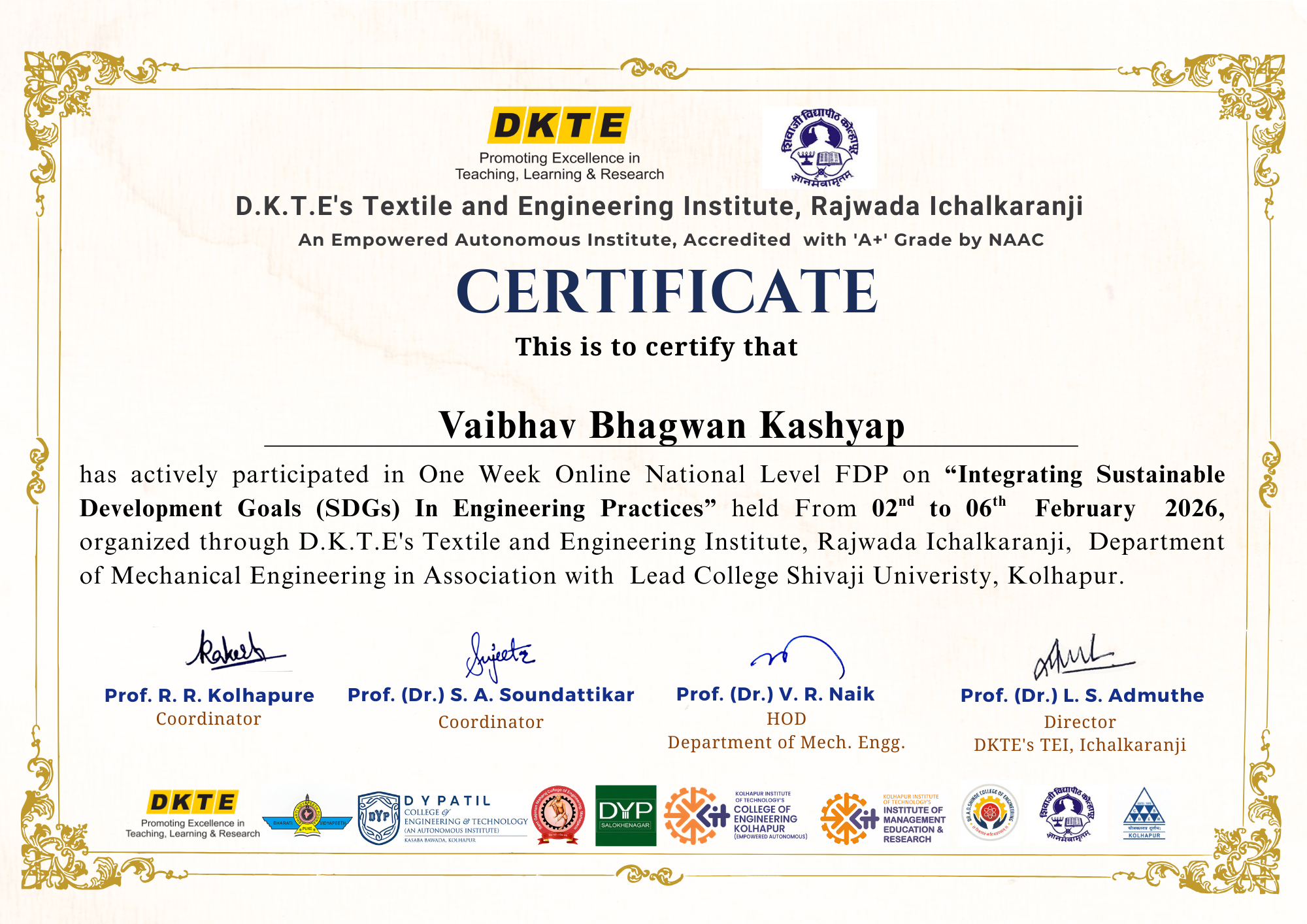 Mr. Vaibhav B Kashyap, Assistant professor in Civil Engineering has attended and successfully completed One-week national level FDP on “Integrating Sustainable Development Goals in Engineering Practices” organized by DKTE's Textile and Engineering Institute, Icchalkaranji, Kolhapur from 2nd – 6th February, 2026.