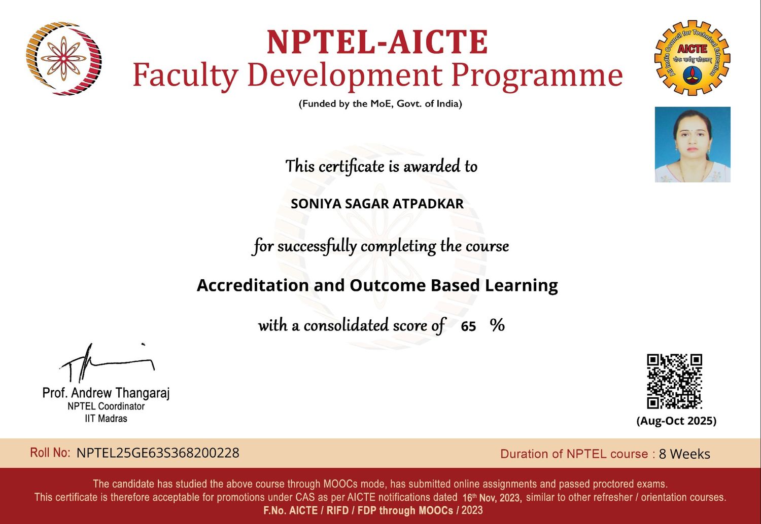 Mrs Soniya Sagar Atpadkar has completed NPTEL certification on "Accreditation and Outcome Based Learning"