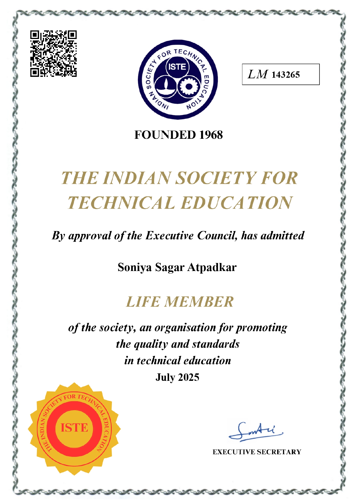Ms. Soniya Sagar Atpadkar is a Life Member of the Indian Society for Technical Education (ISTE).