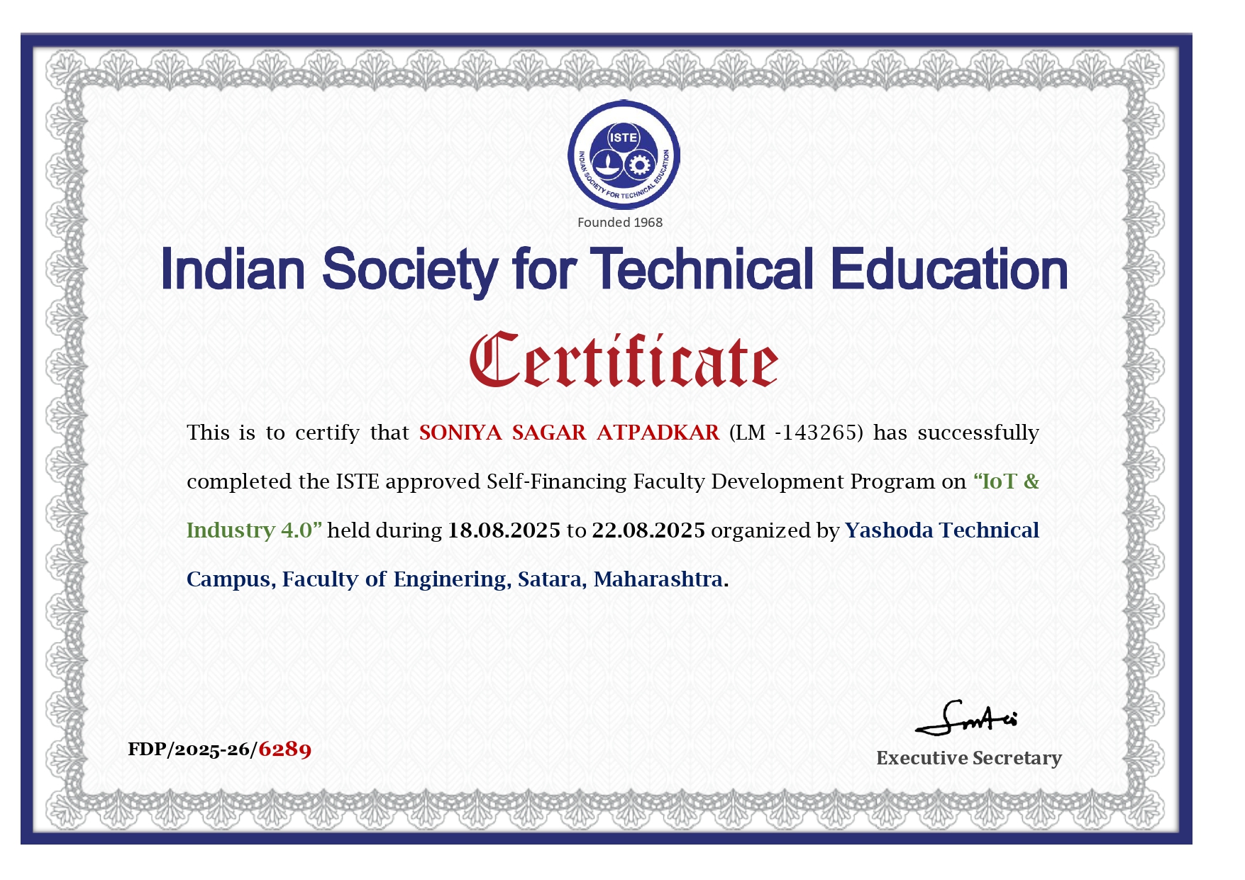 Mrs. Deepa Mahesh Rathod of Yashoda Technical Campus, Satara. has successfully completed ISTE approved Self Financing Faculty Development Program on “IOT & Industry 4.0"