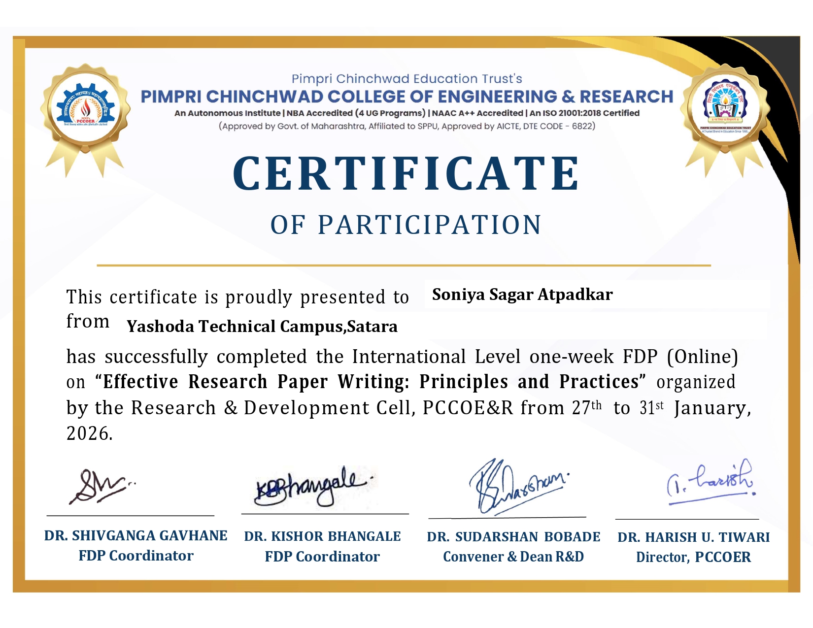 Mrs. Soniya Sagar Atpadkar has successfully participated in the International Level one-week FDP (Online) on “Effective Research Paper Writing: Principles and Practices” organized by the Research & Development Cell, PCCOE & R from 27th 2026. to 31st January 2026