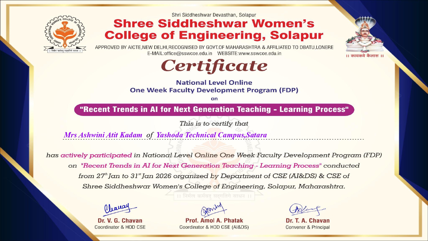 Mrs. Ashwini Atit Kadam has successfully attended the one week national level online faculty development program on "Recent Trends in AI For Next Generation Teaching - Learning Process" held from 27th Jan - 31st Jan 2026.