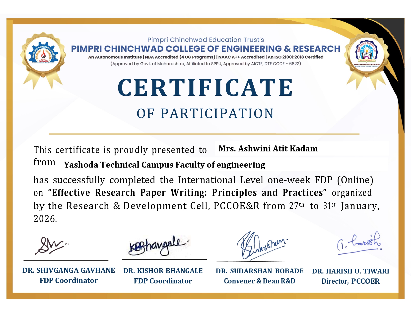 Mrs. Ashwini Atit Kadam has successfully participated in the International Level one-week FDP (Online) on “Effective Research Paper Writing: Principles and Practices” organized by the Research & Development Cell, PCCOE & R from 27th 2026. to 31st January 2026